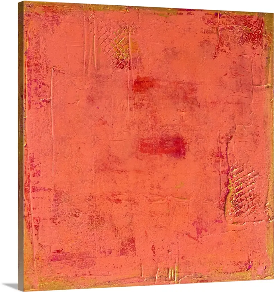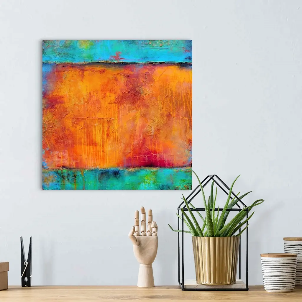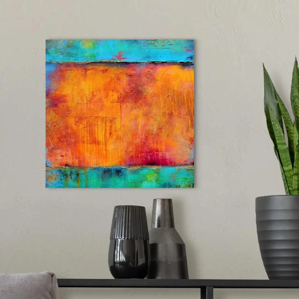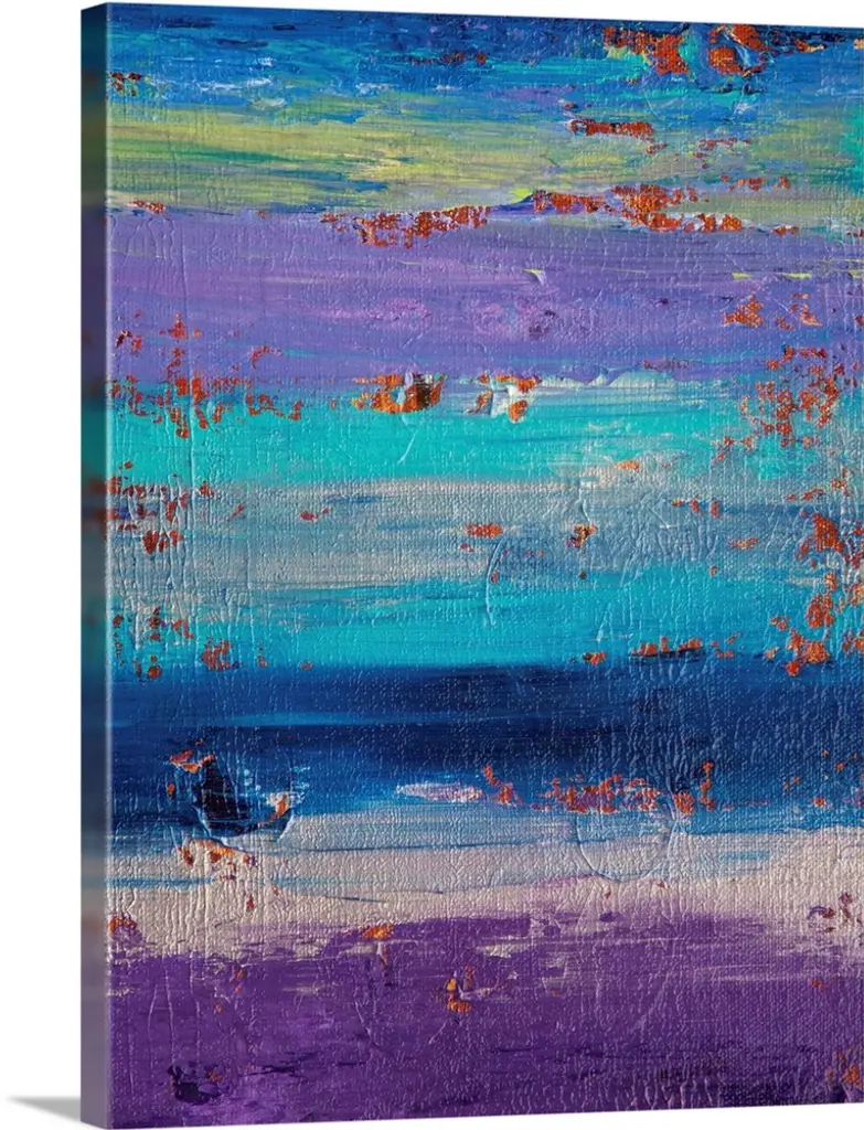 A vividly colored gicloe print of contemporary painting created with building up layers of paint then sanding them down to reveal the colors beneath.