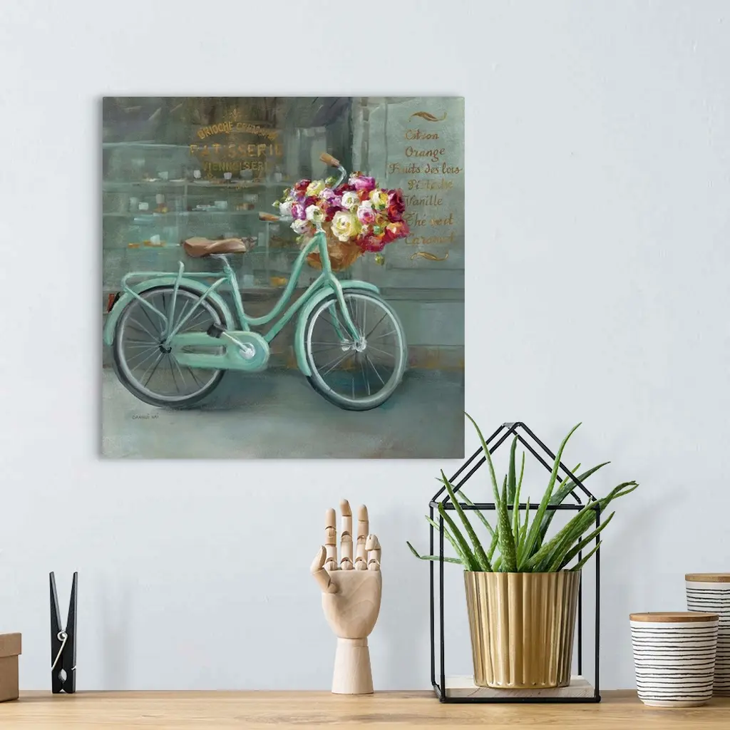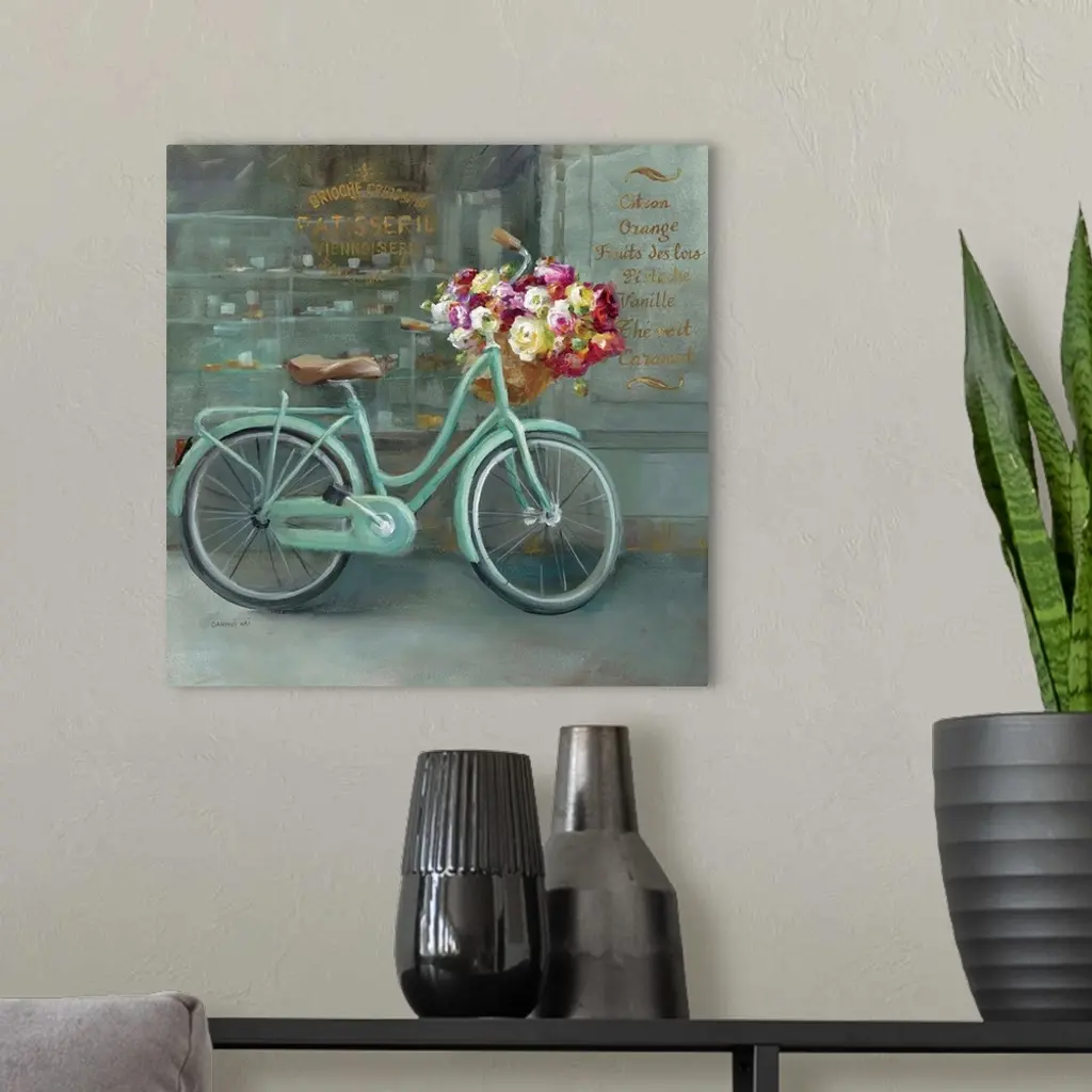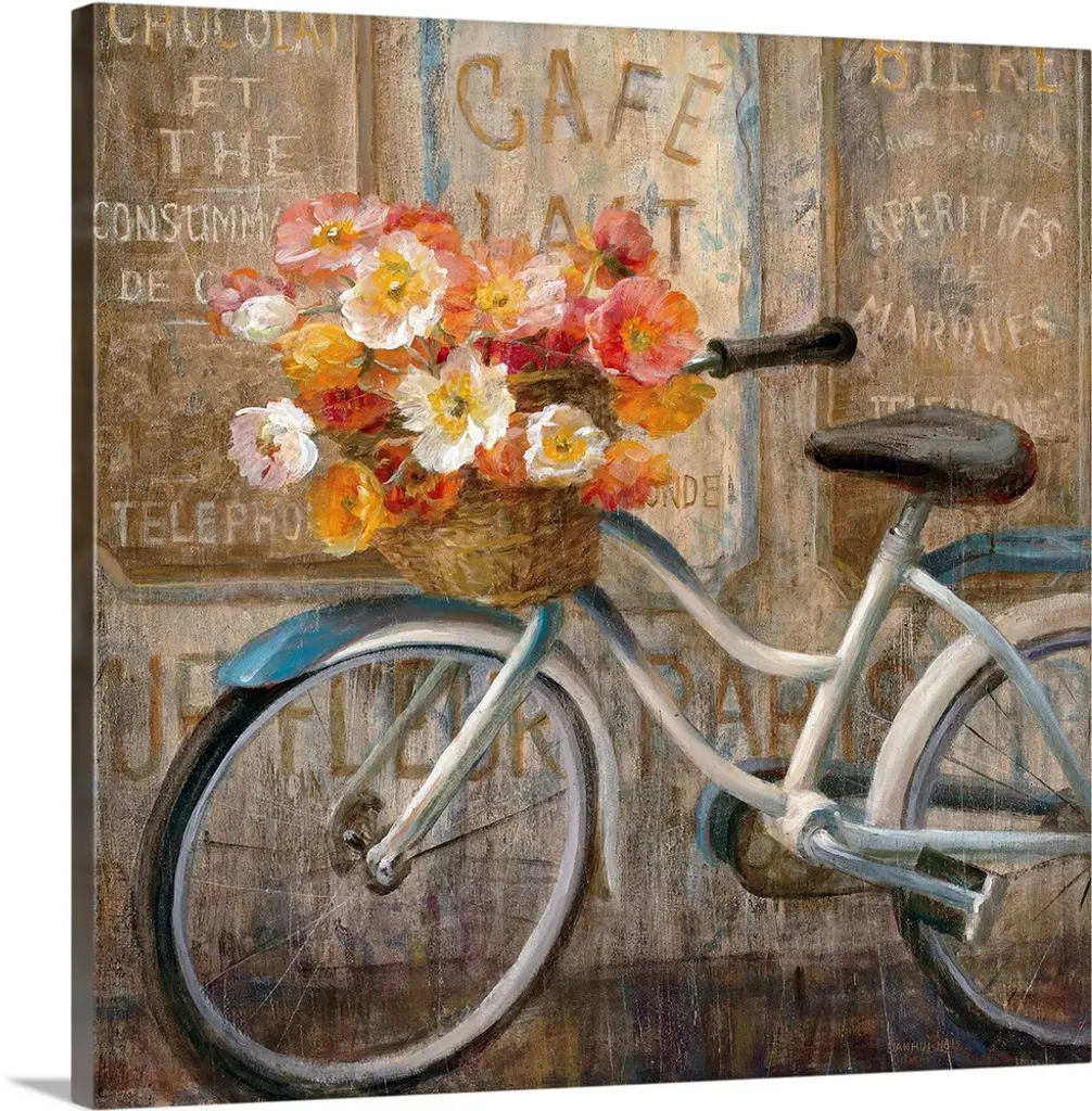 Contemporary artwork of a bicycle with flowers in the handlebar basket.