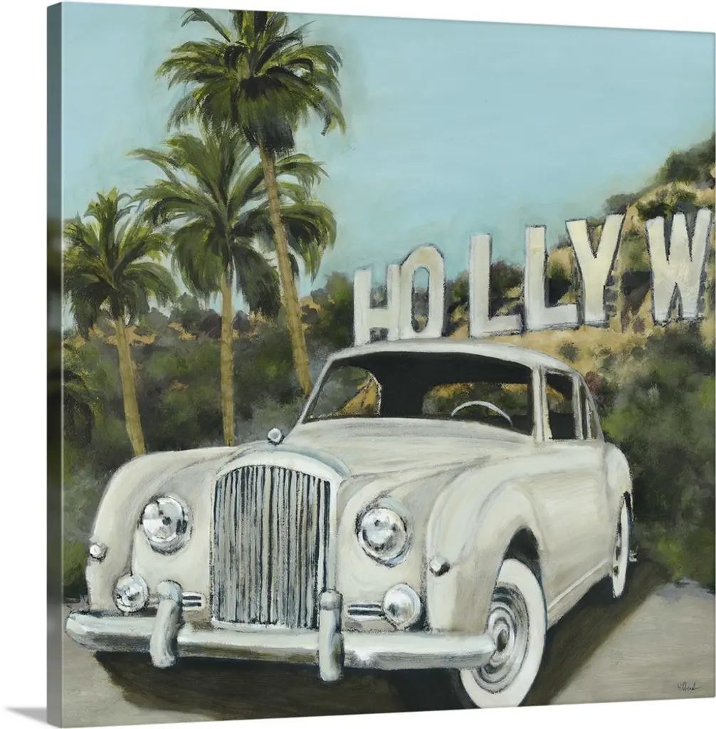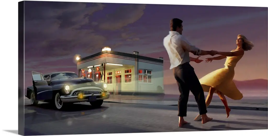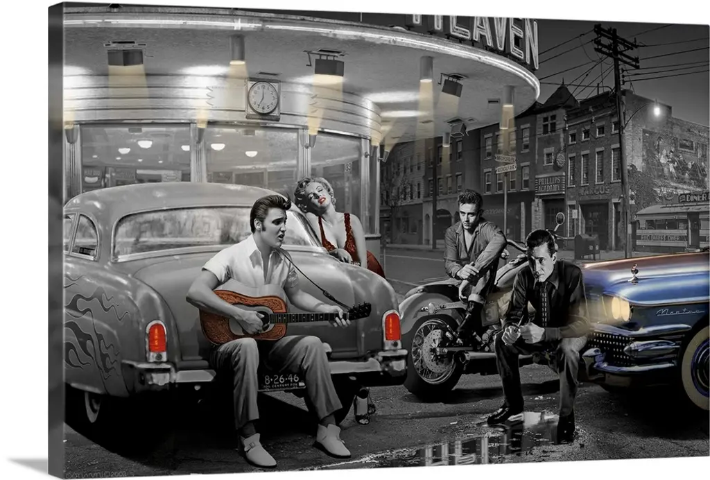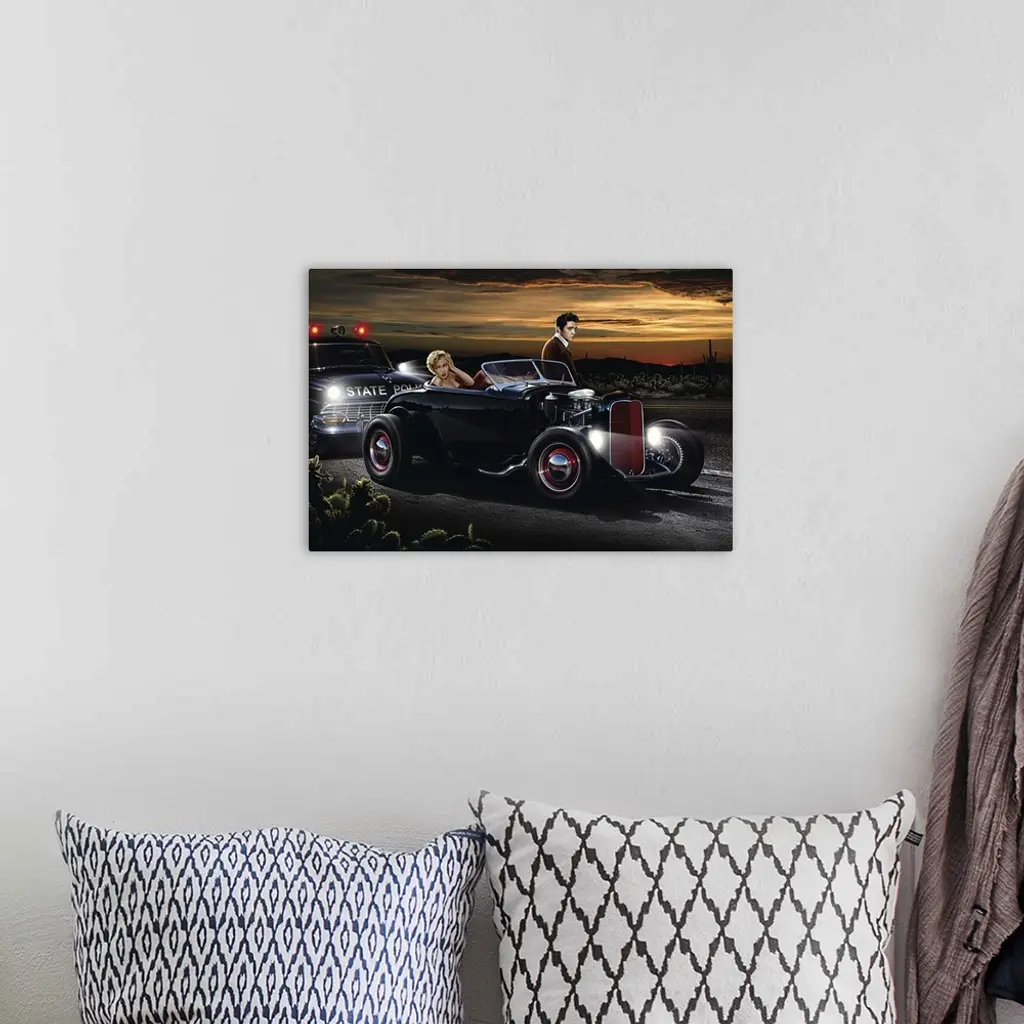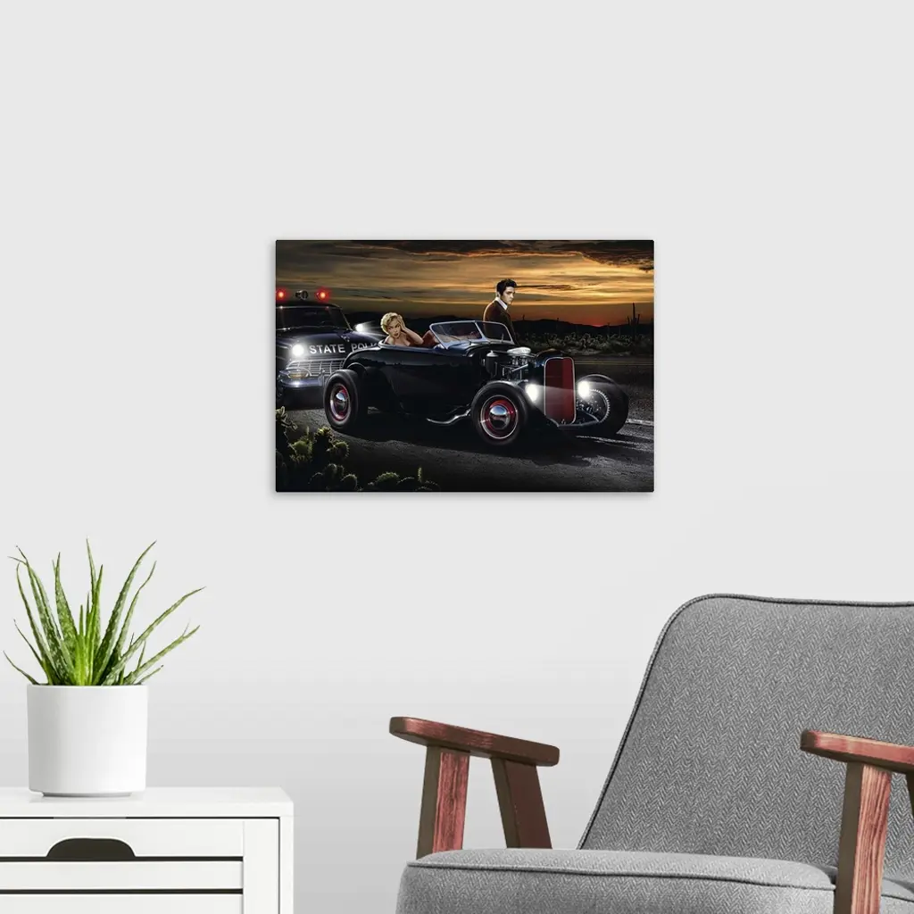 Digital art painting of Marilyn and Elvis in a roadster being pulled over by the State Police by Helen Flint.