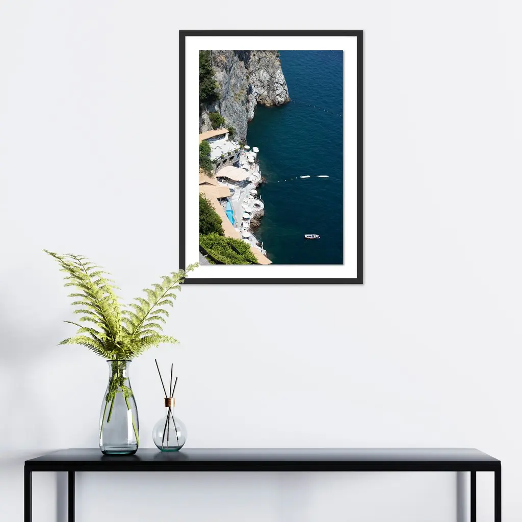The next best thing to vacationing at an Italian waterfront inn? Gazing at this aerial photo by Judith Gigliotti of a bellissimo albergo, or beautiful auberge, overlooking crystalline waters. The giclée print arrives framed and ready to hang.Judith Gigliotti was born in Chicago and attended Boston University, the Sorbonne, and the California College of Arts and Crafts. Before turning to photography, she explored painting, textiles, and ceramics. She gains her energy and inspiration from her seven children, seven grandchildren, husband, and yellow Lab.