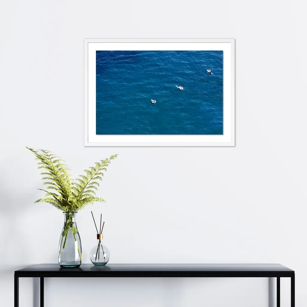 The next best thing to floating amid the sparkling blue waters off the Italian coast? Gazing at this aerial photo by Judith Gigliotti depicting others doing so. The giclée print arrives framed and ready to hang.Judith Gigliotti was born in Chicago and attended Boston University, the Sorbonne, and the California College of Arts and Crafts. Before turning to photography, she explored painting, textiles, and ceramics. She gains her energy and inspiration from her seven children, seven grandchildren, husband, and yellow Lab.