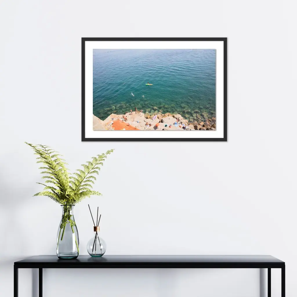 Judith Gigliotti's aerial photograph of swimmers, boaters, and sunbathers along the Italian coast lets you relish the glories of summertime—and Italy—year-round. The giclée print arrives framed and ready to hang.Judith Gigliotti was born in Chicago and attended Boston University, the Sorbonne, and the California College of Arts and Crafts. Before turning to photography, she explored painting, textiles, and ceramics. She gains her energy and inspiration from her seven children, seven grandchildren, husband, and yellow Lab.
