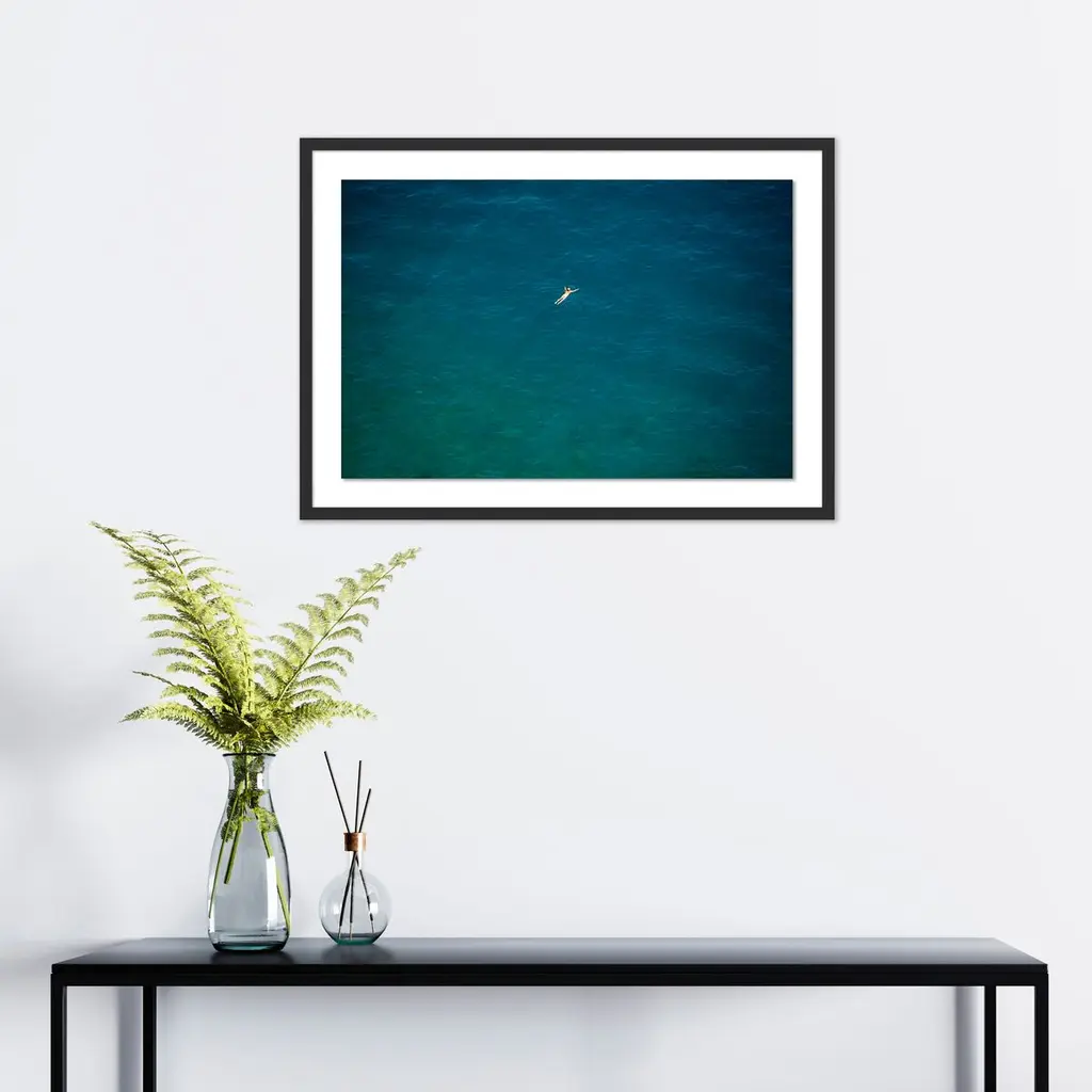 This aerial photo by Judith Gigliotti, depicting a solo floater in the waters off the Italian coast, captures the serenity of joyful solitude. The giclée print arrives framed and ready to hang.Judith Gigliotti was born in Chicago and attended Boston University, the Sorbonne, and the California College of Arts and Crafts. Before turning to photography, she explored painting, textiles, and ceramics. She gains her energy and inspiration from her seven children, seven grandchildren, husband, and yellow Lab.
