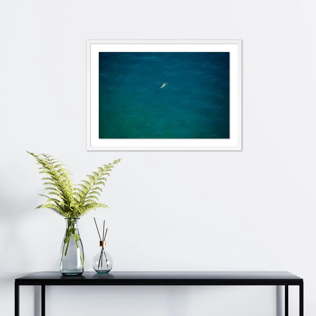 This aerial photo by Judith Gigliotti, depicting a solo floater in the waters off the Italian coast, captures the serenity of joyful solitude. The giclée print arrives framed and ready to hang.Judith Gigliotti was born in Chicago and attended Boston University, the Sorbonne, and the California College of Arts and Crafts. Before turning to photography, she explored painting, textiles, and ceramics. She gains her energy and inspiration from her seven children, seven grandchildren, husband, and yellow Lab.