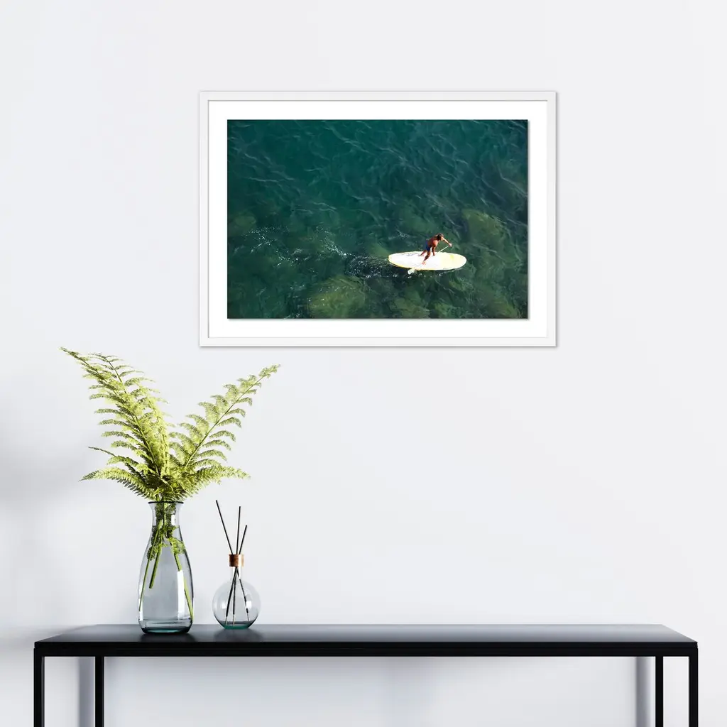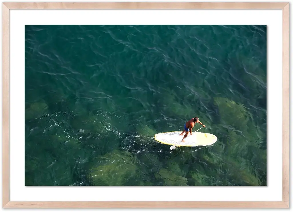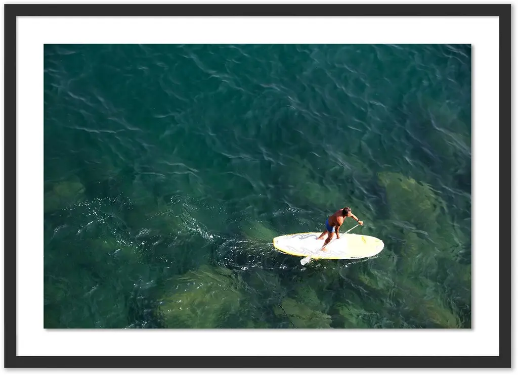 This aerial photograph by Judith Gigliotti captures a lone paddle boarder savoring the idyllic beauty of the crystalline waters off the Italian coast. The giclée print arrives framed and ready to hang.Judith Gigliotti was born in Chicago and attended Boston University, the Sorbonne, and the California College of Arts and Crafts. Before turning to photography, she explored painting, textiles, and ceramics. She gains her energy and inspiration from her seven children, seven grandchildren, husband, and yellow Lab.