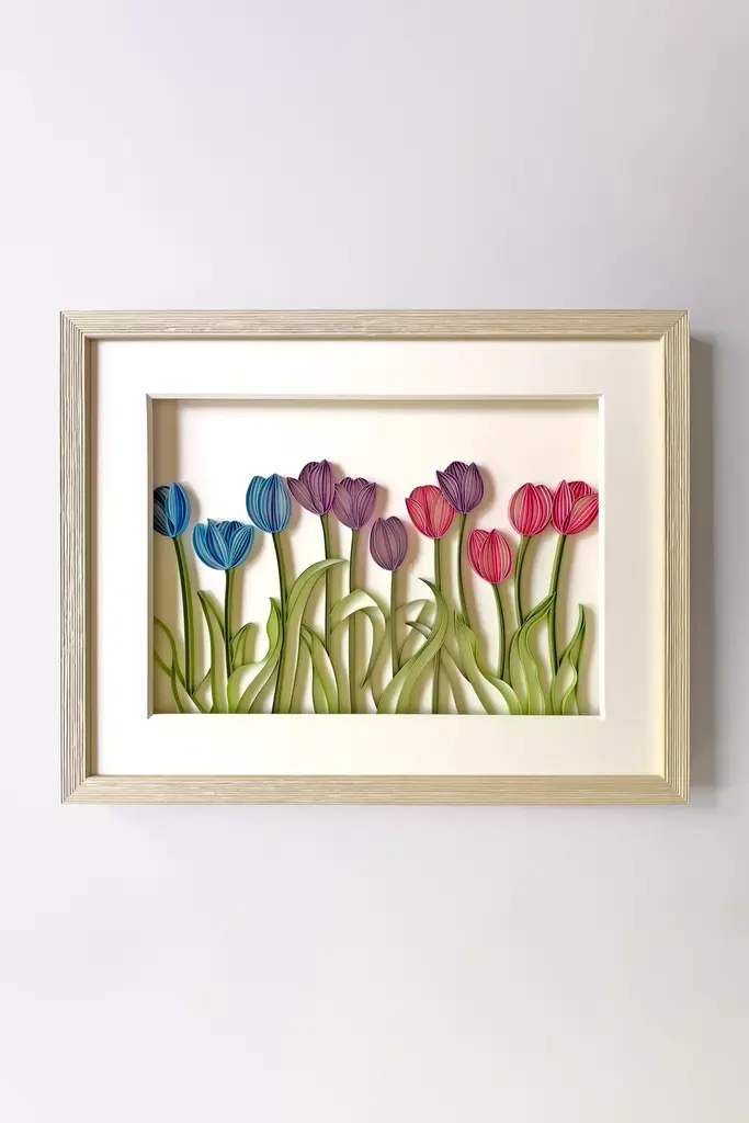 **Please note that all sales are final.**Bright, happy, and a little bit sassy, these perky tulips are handcrafted by JUDiTH+ROLFE using edge-glued paper strips, a modern take on the traditional craft of quilling (also known as paper filigree). Thoughtfully composed, each petal and leaf pops with dimensional detail, bringing bold color and a fresh, nature-inspired accent to any space. *Introducing the first-ever Nest Fellowship Program, supporting emerging makers and artisans with business grants, dedicated mentorship, and a commission-free platform to share their handmade designs on Anthropologies new digital marketplace.* *Discover the collections and shop one-of-a-kind pieces created by our inaugural fellows.* * Sold individually* Every artwork is individually made by hand, expect slight variations in each unique piece* Acid-free paper on conservation mat board* Rustic barnwood shadowbox frame with UV acrylic protection* Wired and ready to hang* Made in USA#### *Dimensions** 19.5"W x 15.5"H x 1.4"D