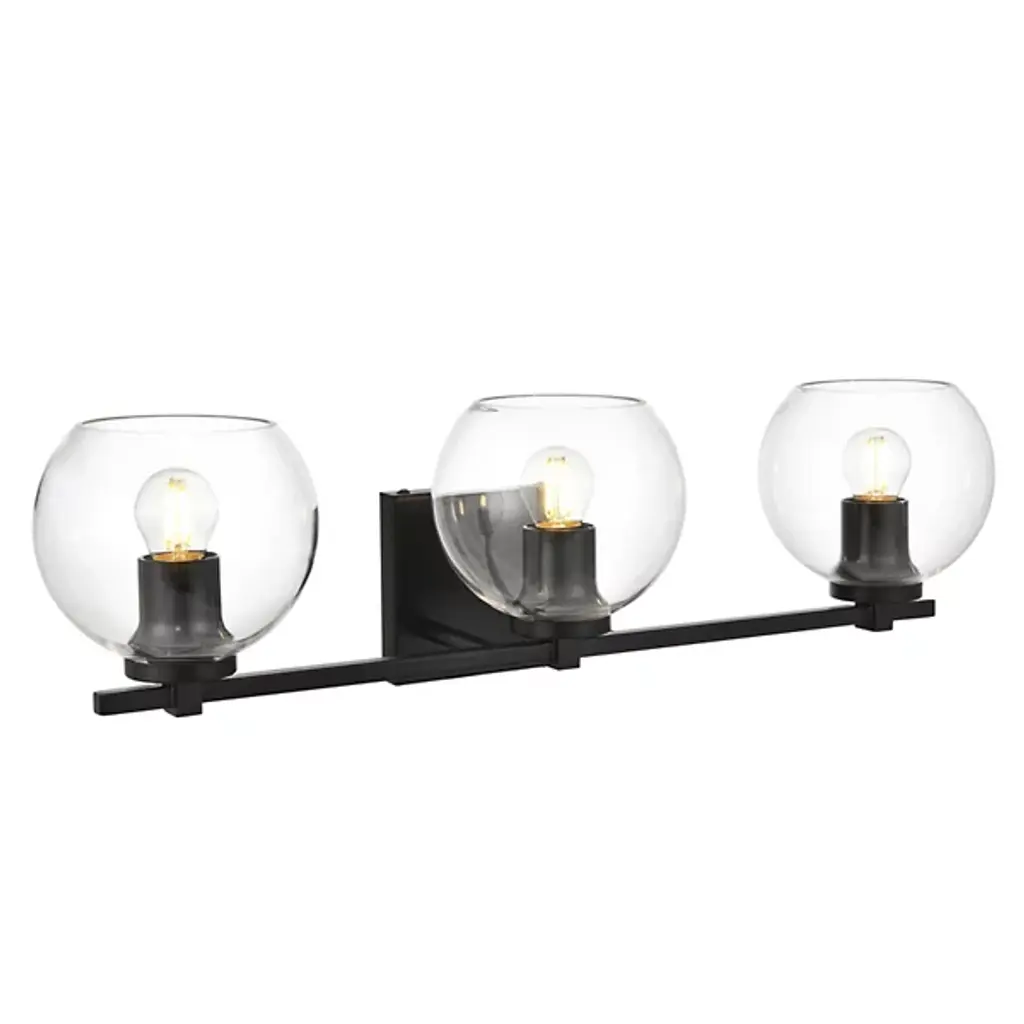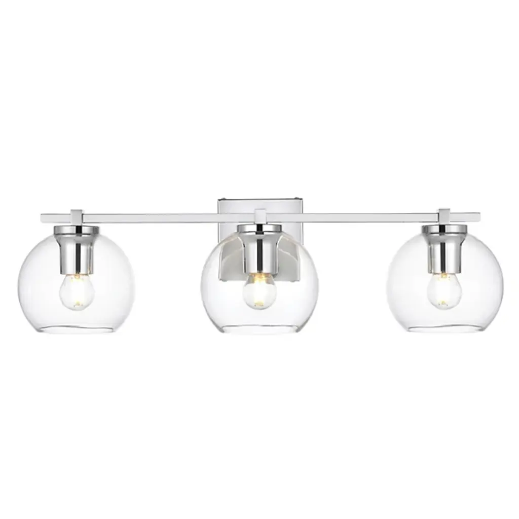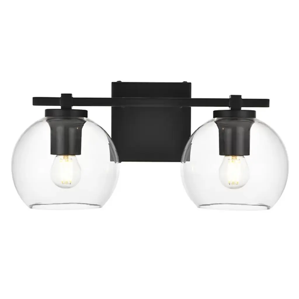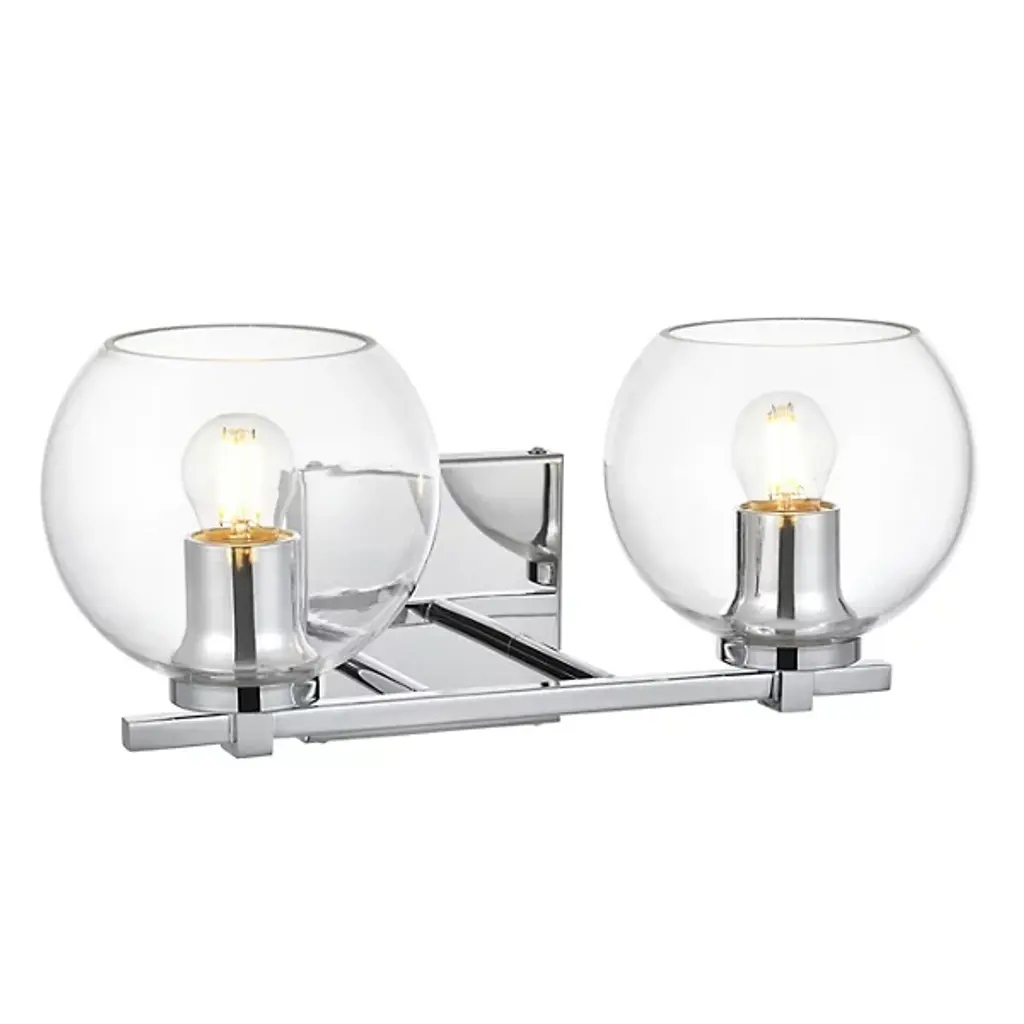 The Juelz Vanity Light from Elegant Lighting features twin clear glass globes resembling soap bubbles. Each open crystal ball houses an exposed bulb that casts a beaming glow. The fixture's versatility shines through its ability to be installed as an uplight or downlight, adapting to diverse design preferences. Its dual-bulb vanity light's dimmer compatibility allows for precise ambiance control. The sleek metal arm and straight-line details of its backplate exude contemporary charm.