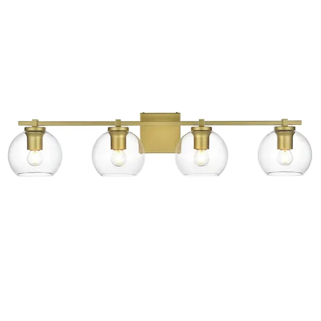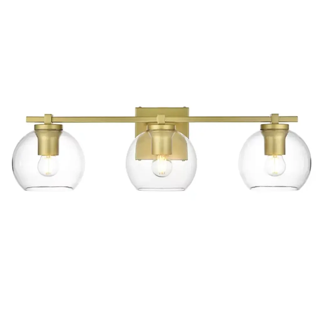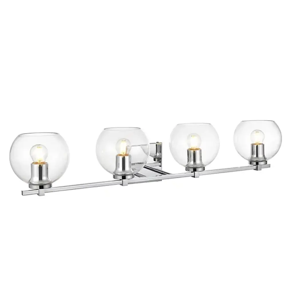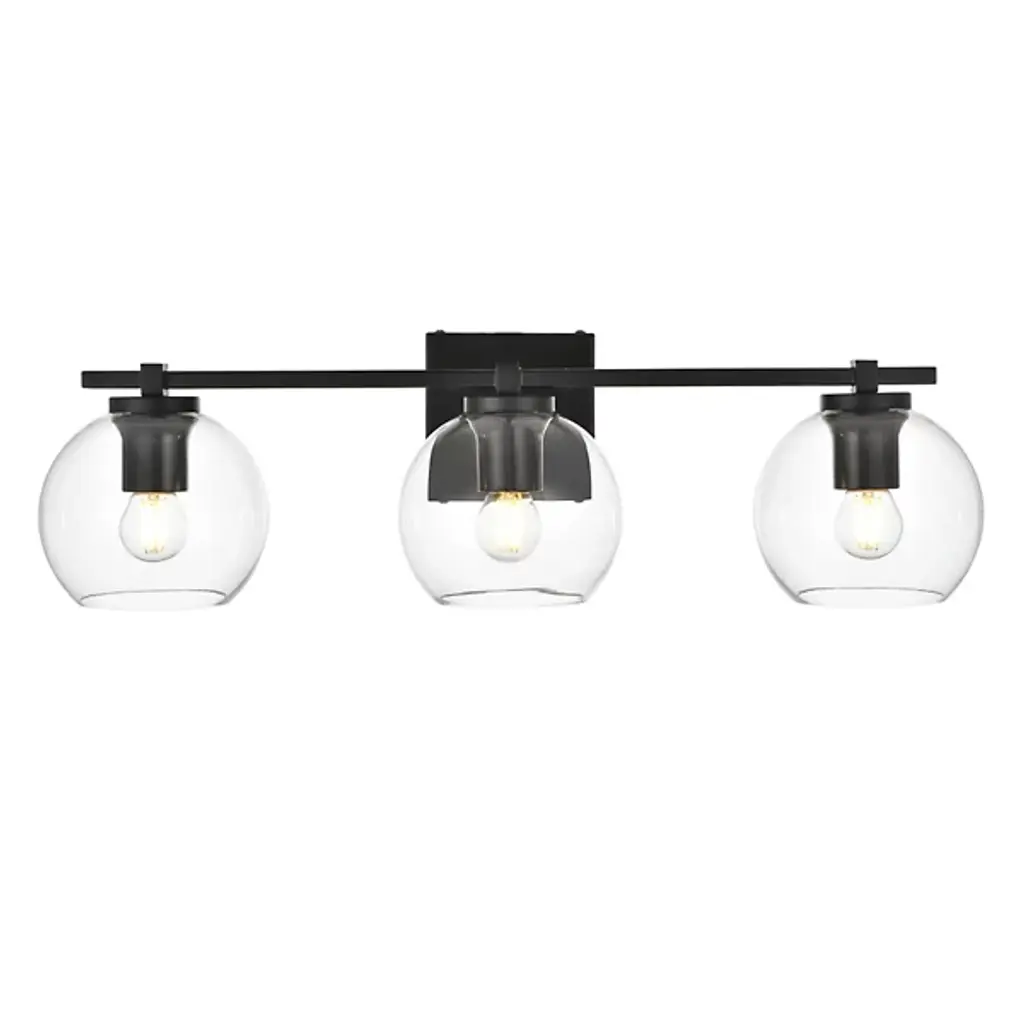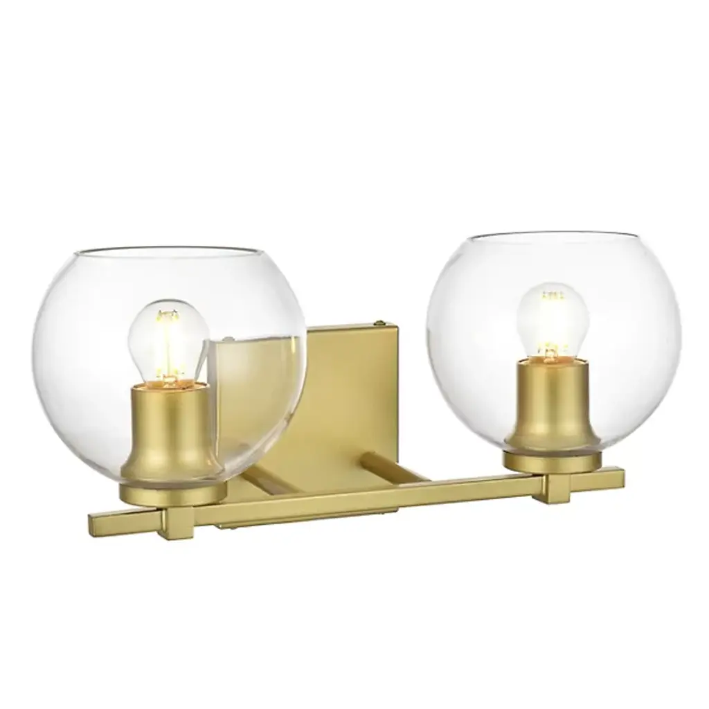 The Juelz Vanity Light from Elegant Lighting features twin clear glass globes resembling soap bubbles. Each open crystal ball houses an exposed bulb that casts a beaming glow. The fixture's versatility shines through its ability to be installed as an uplight or downlight, adapting to diverse design preferences. Its dual-bulb vanity light's dimmer compatibility allows for precise ambiance control. The sleek metal arm and straight-line details of its backplate exude contemporary charm.