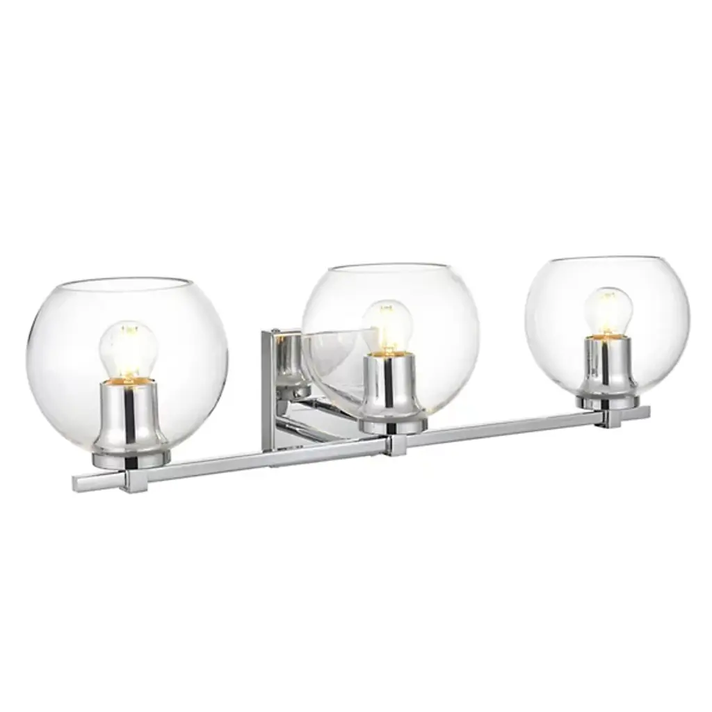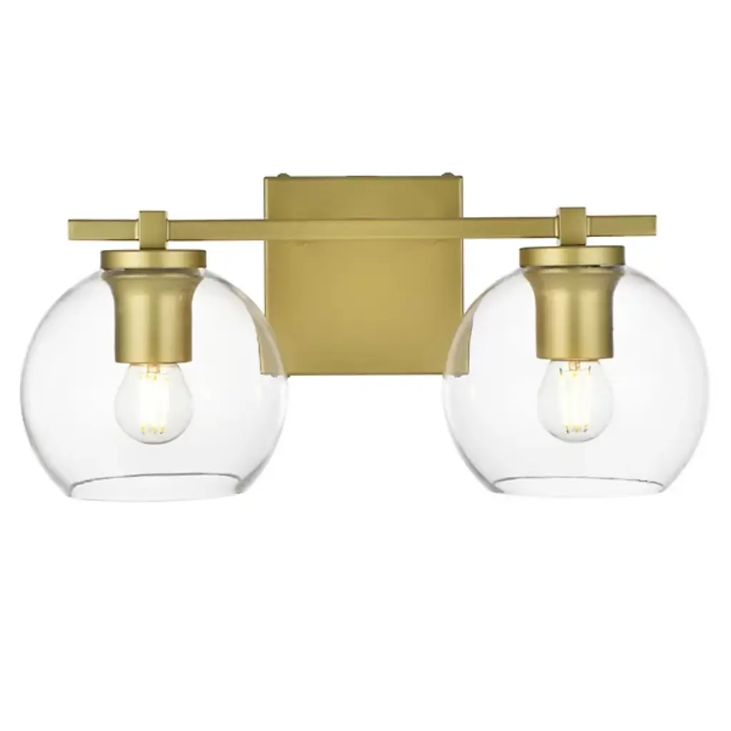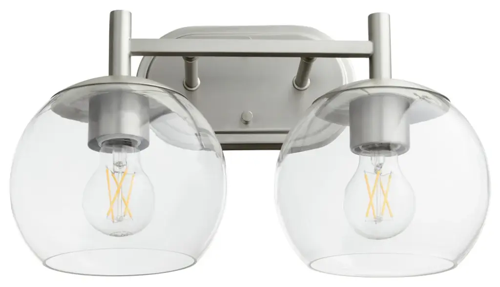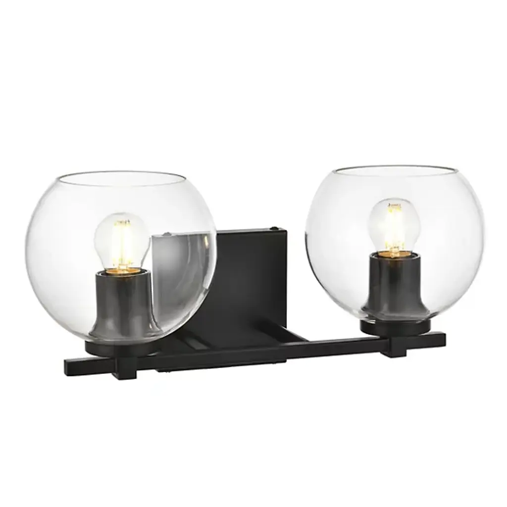 The Juelz Vanity Light from Elegant Lighting features twin clear glass globes resembling soap bubbles. Each open crystal ball houses an exposed bulb that casts a beaming glow. The fixture's versatility shines through its ability to be installed as an uplight or downlight, adapting to diverse design preferences. Its dual-bulb vanity light's dimmer compatibility allows for precise ambiance control. The sleek metal arm and straight-line details of its backplate exude contemporary charm.