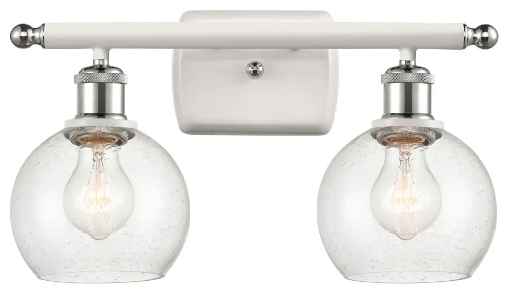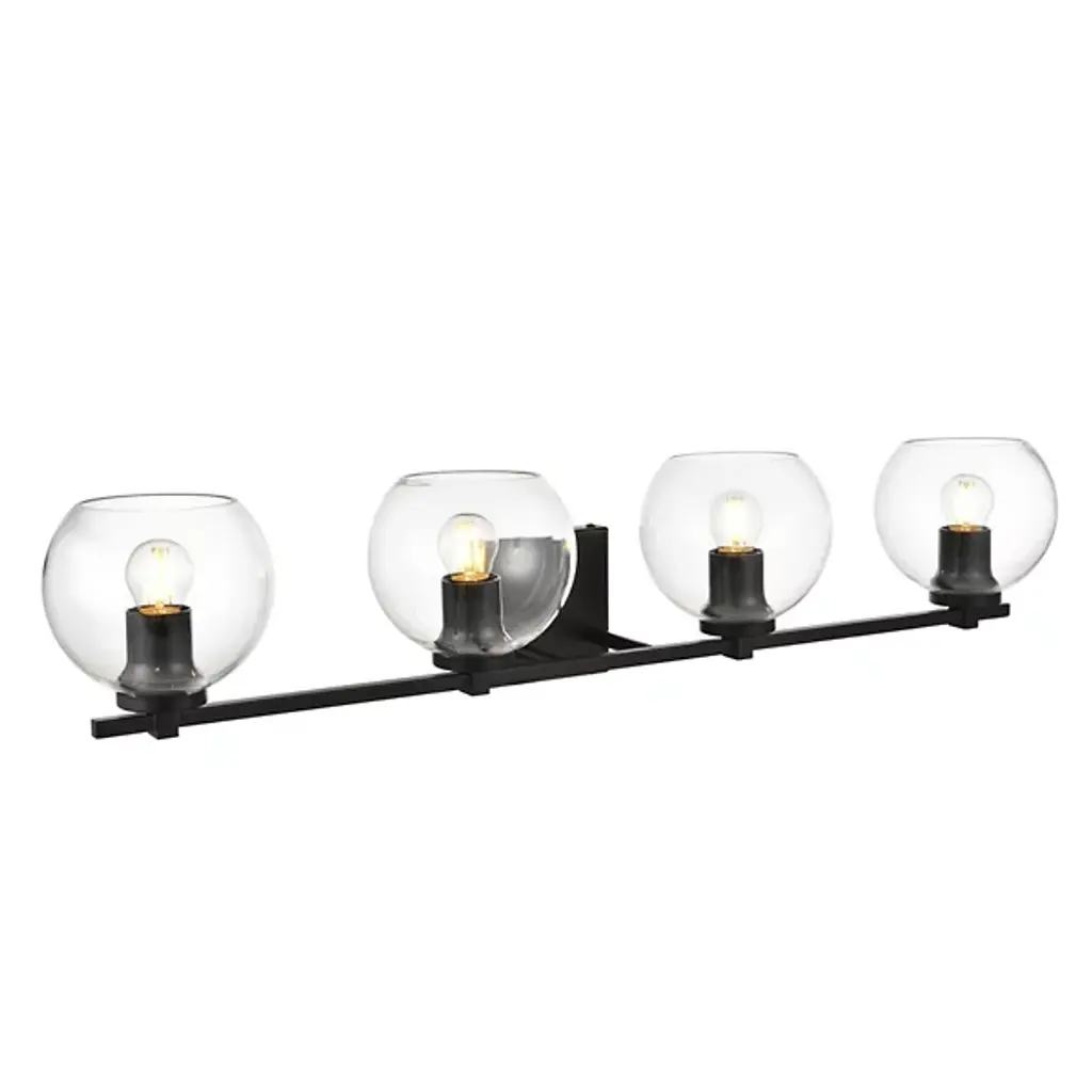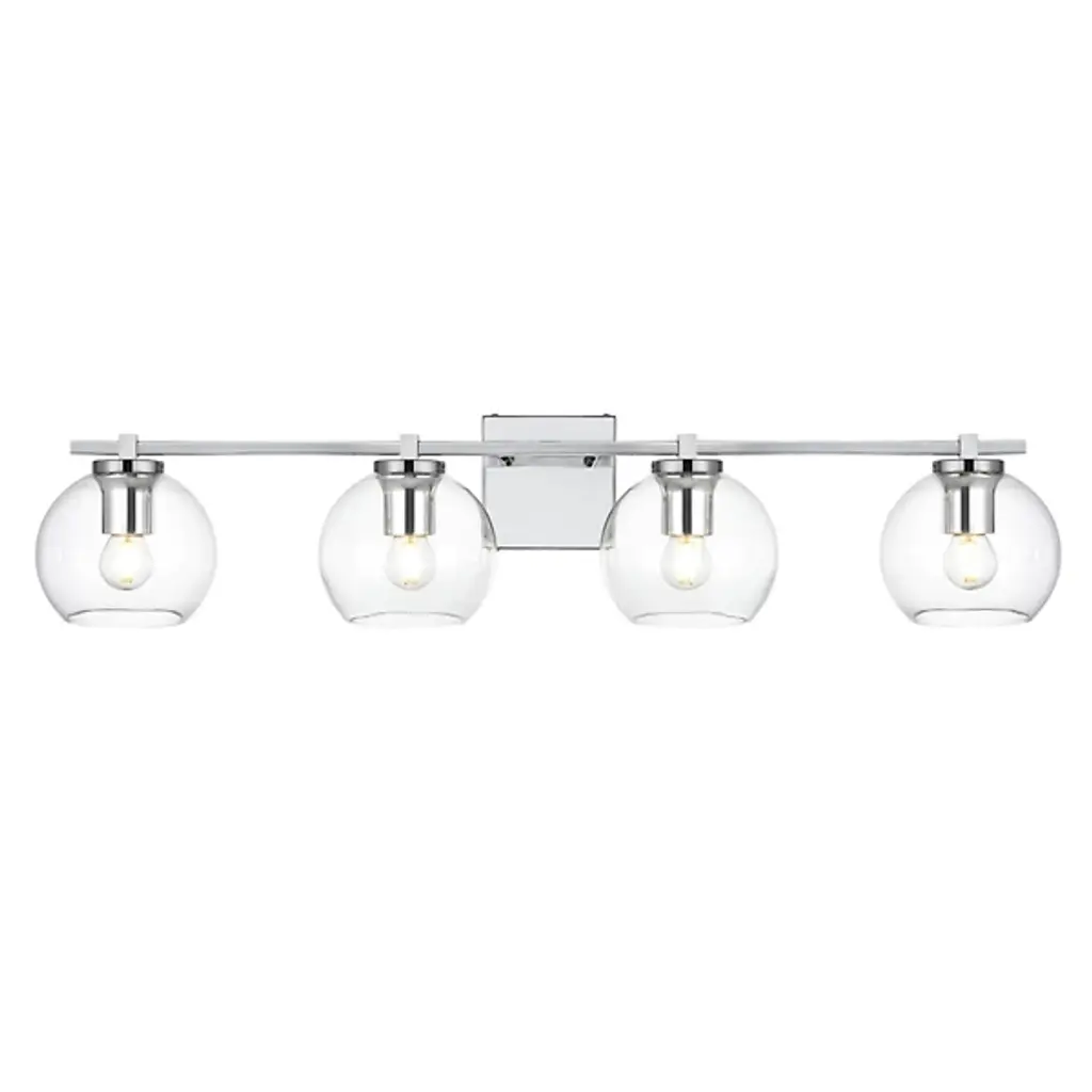 The Juelz Vanity Light from Elegant Lighting features twin clear glass globes resembling soap bubbles. Each open crystal ball houses an exposed bulb that casts a beaming glow. The fixture's versatility shines through its ability to be installed as an uplight or downlight, adapting to diverse design preferences. Its dual-bulb vanity light's dimmer compatibility allows for precise ambiance control. The sleek metal arm and straight-line details of its backplate exude contemporary charm.
