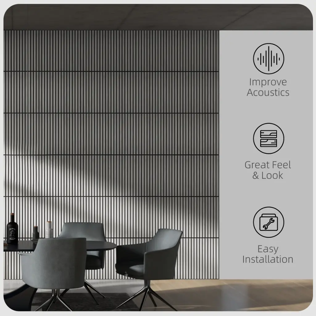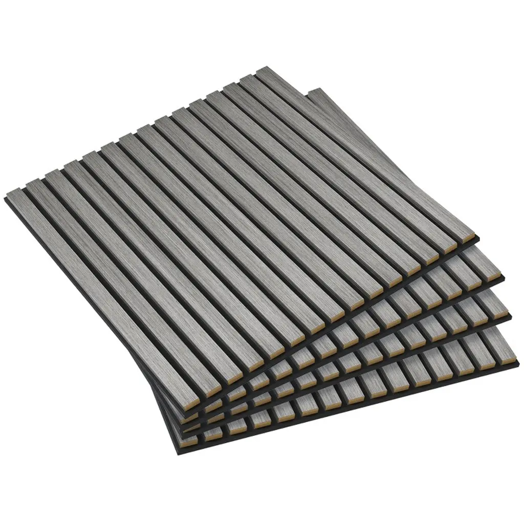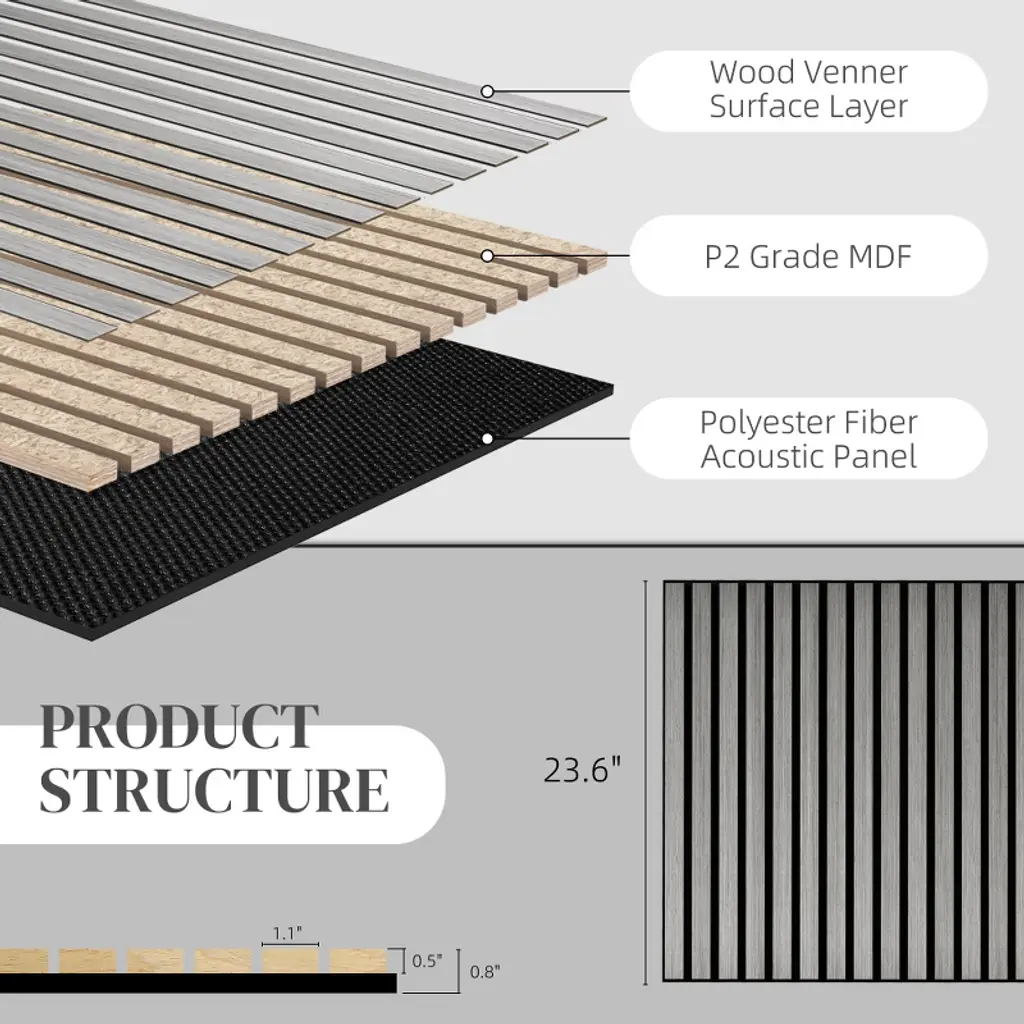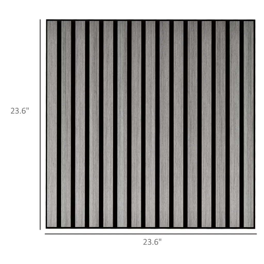 These acoustic wall panels are designed to reduce noise and improve sound clarity, making them ideal for home offices, entertainment rooms, or conference areas. Featuring a modern gray tone and slatted design, they add a stylish and natural touch to any space. Made from MDF and high-density polyester fiber, they are safe, low-emission, and eco-friendly. Each pack includes 4 panels, covering a large area with flexibility in placement on walls or ceilings. Measuring 23.6" x 23.6", they are easy to install using the included screws or adhesive, providing both function and aesthetic appeal.