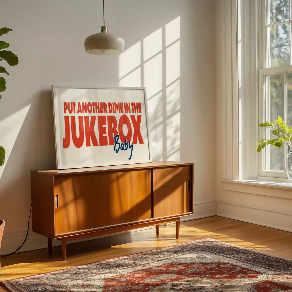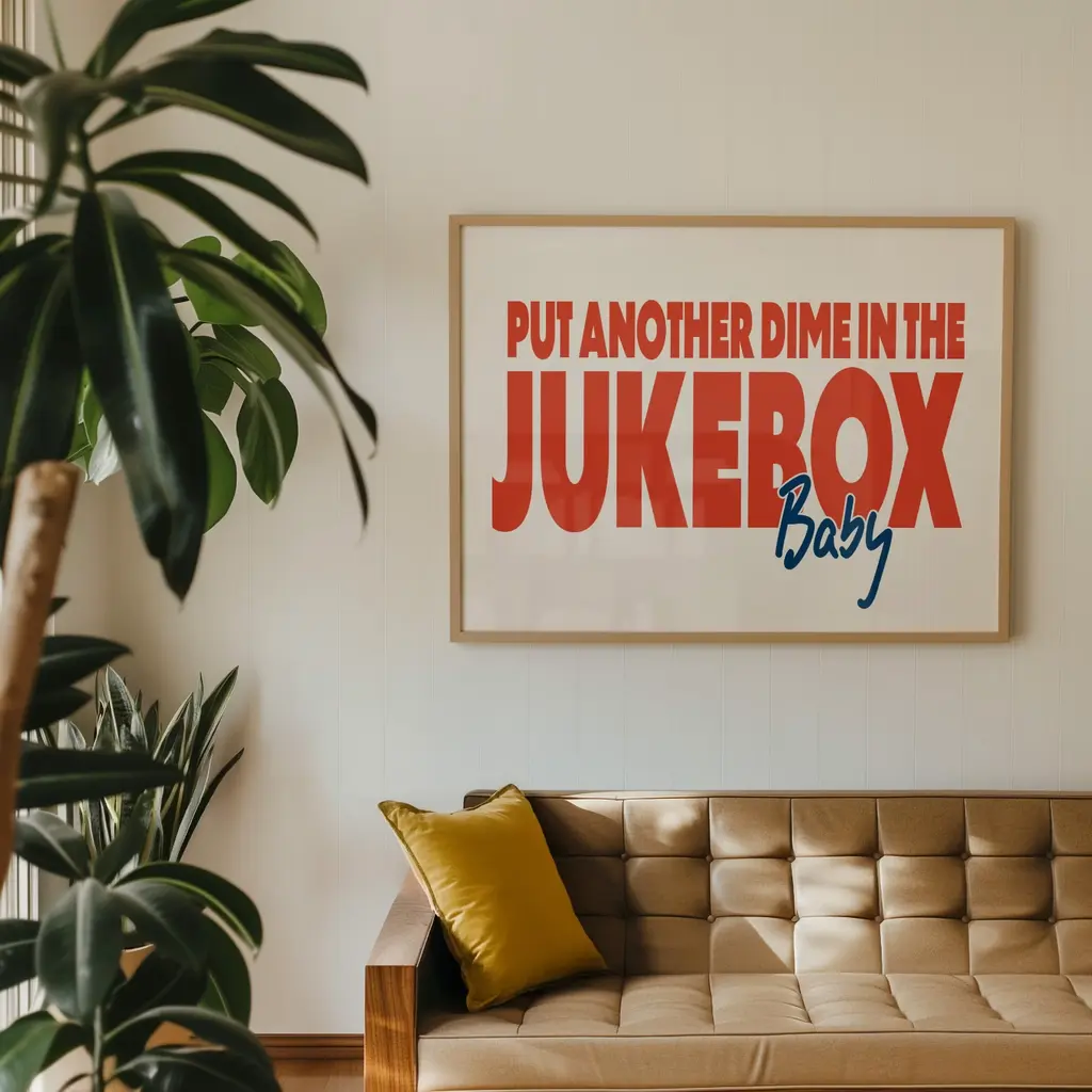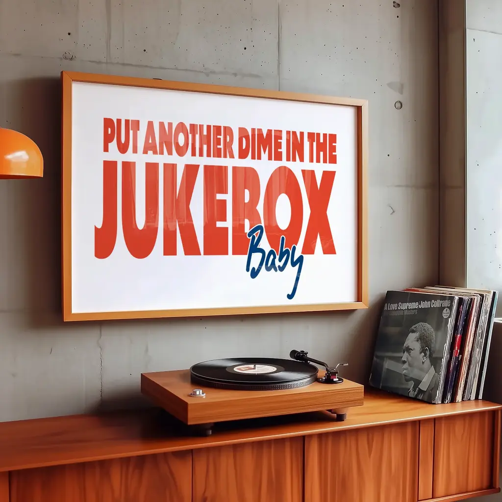 I love Rock and Roll - Put Another Dime In the Jukebox Baby.Retro Music Music Art Print. Sold without frameGiclée printed on Munken pure smooth cream paper which is certified by the Rainforest Alliance Program for FSC® Standards.
