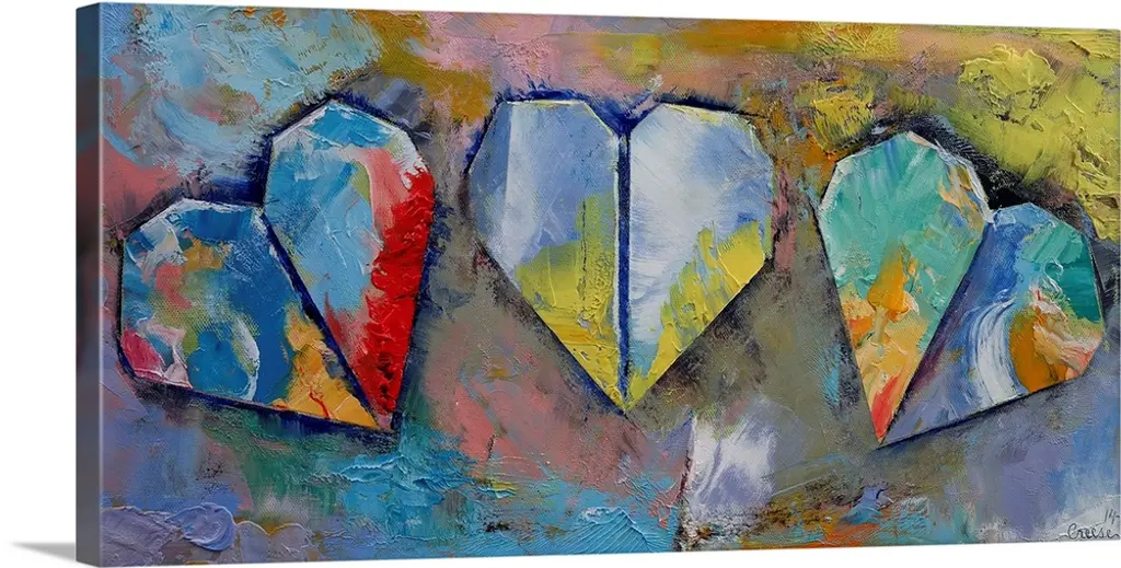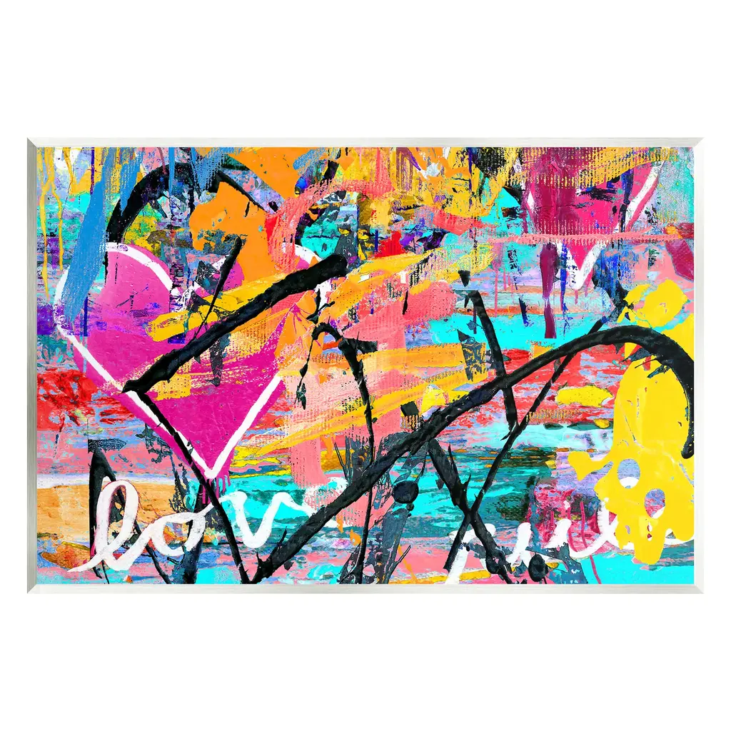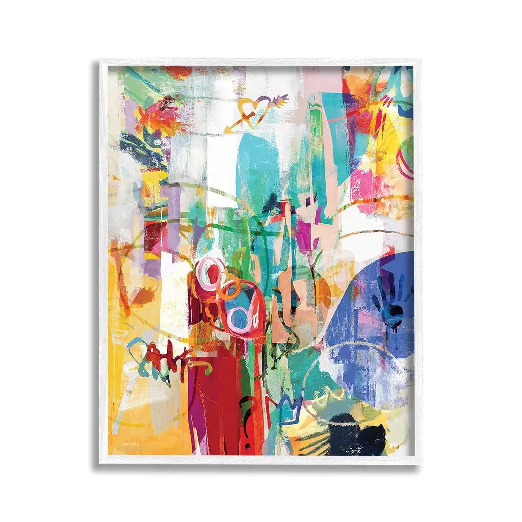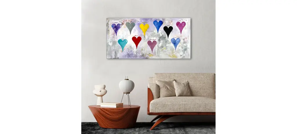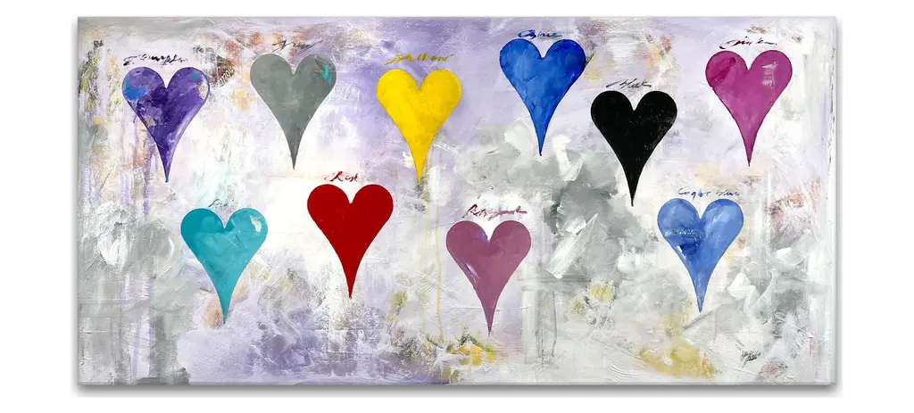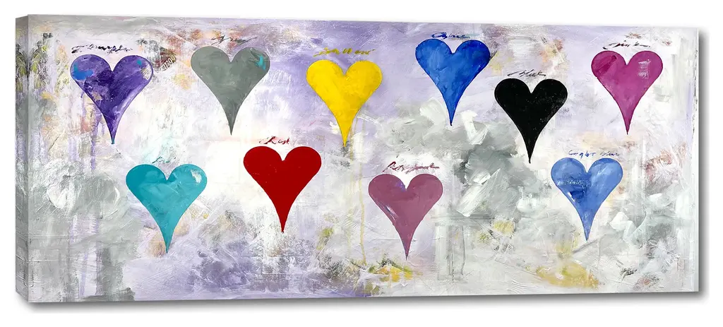 Spread the love in your space with this modern abstract geometric canvas art titled "Jules" by Salvatore Principe. The horizontal decorative artwork featuring hearts in rich tones of purple, green, yellow, blue, black, pink, red, and white will complement your space with its striking romantic abstract aesthetic. Designed and handcrafted in Chattanooga, Tennessee by Ready2HangArt using a locally sourced artist print on canvas, and assembled on an eco-friendly pine wood frame finished with a rear hanger for simple installation. This canvas art vividly captures the contemporary style and bold hues found in the Salvatore Principe collection.