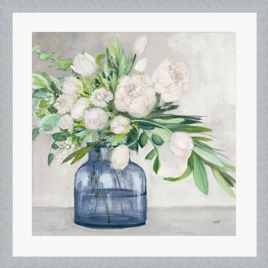 Spring Bouquet Indigo by Julia Purinton is a high quality piece of framed artwork. The finished size of this piece is 23.25" X 23.25". It has a Slim Solid Platinum Silver frame, is single matted and finished with high quality Acrylic Plexiglass. 100% Satisfaction Guaranteed.