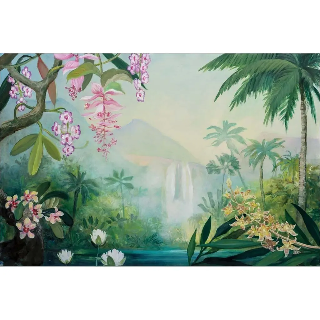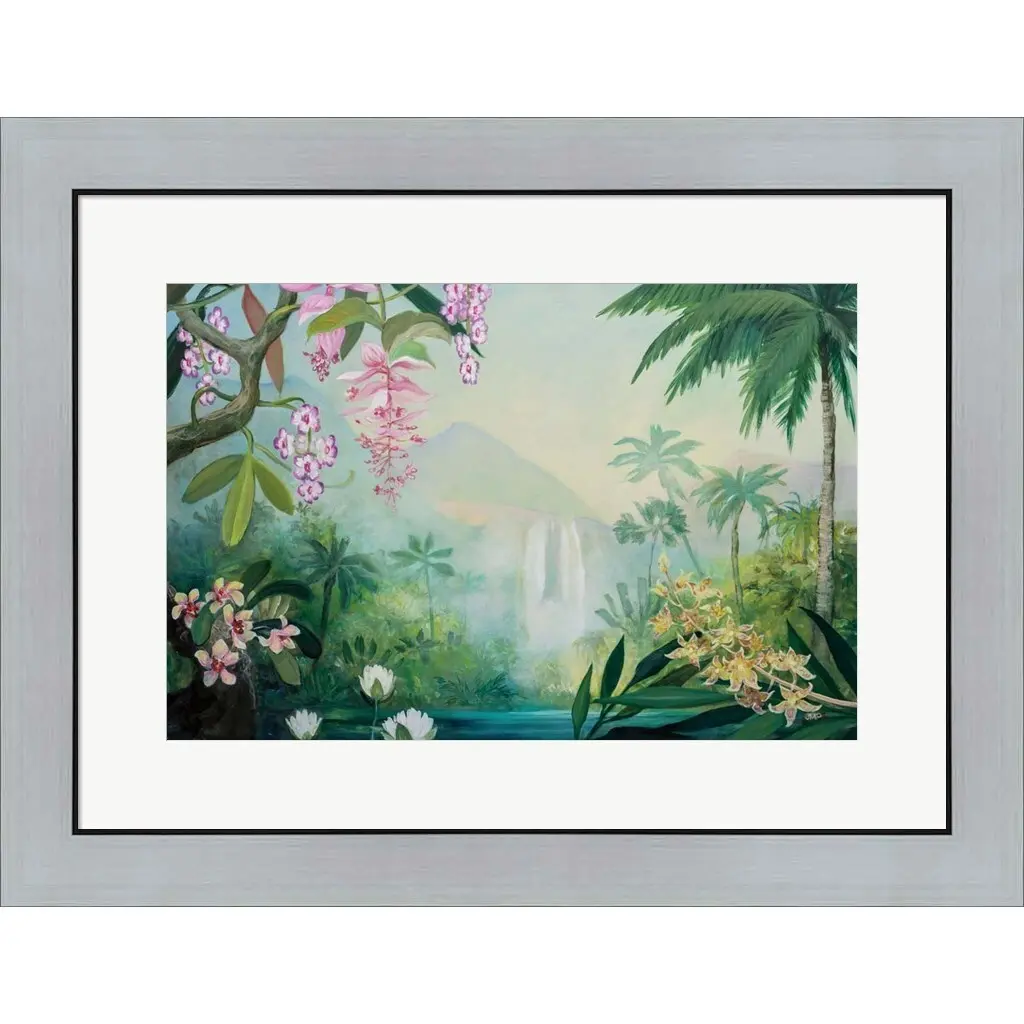 Tropical Falls by Julia Purinton is a high quality piece of framed artwork. The finished size of this piece is 26.25" X 20.25". It has a Solid Chrome Wire Brushed Silver with Black Edges frame, is single matted and finished with high quality Acrylic Plexiglass. 100% Satisfaction Guaranteed.