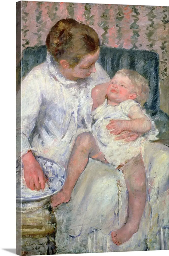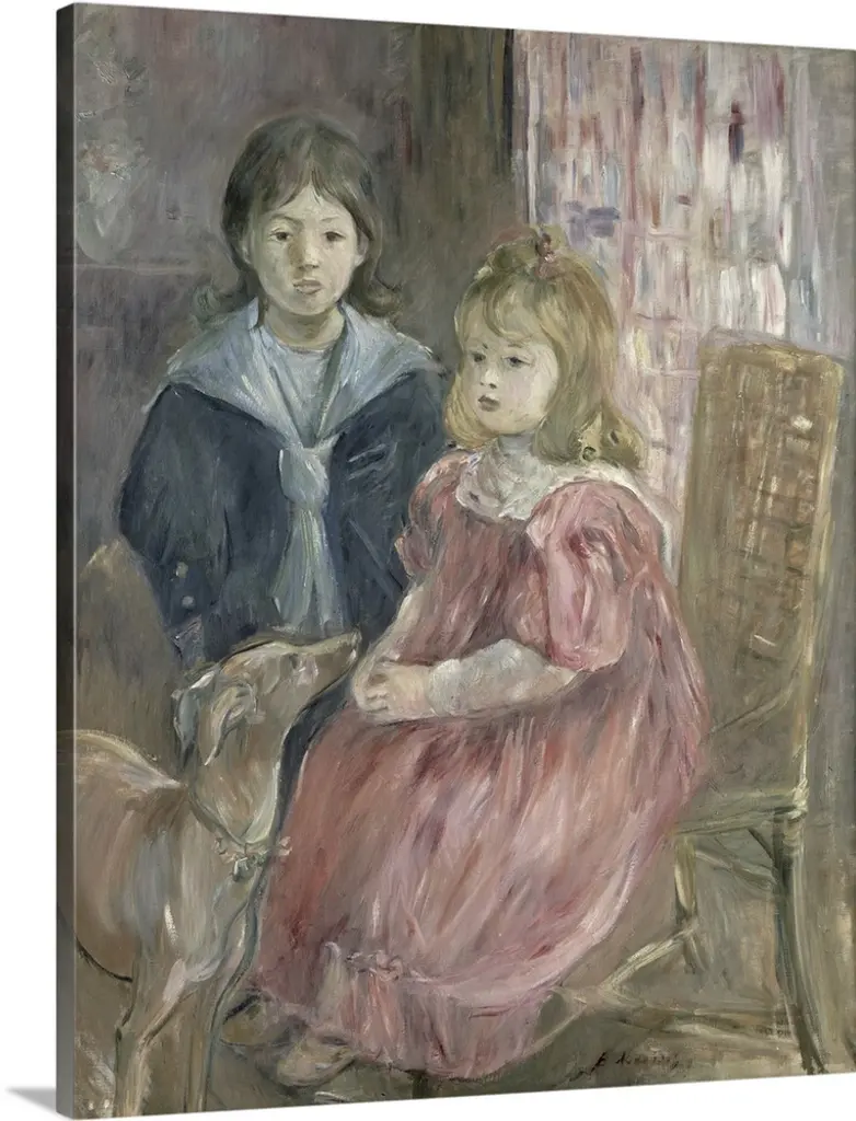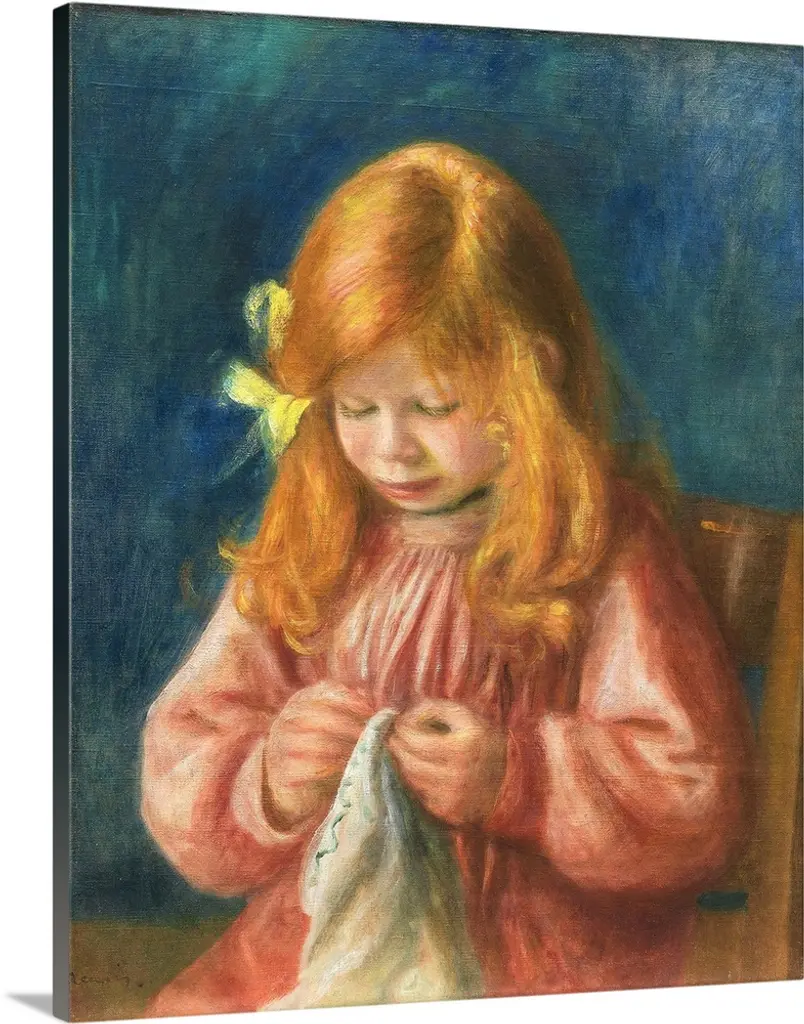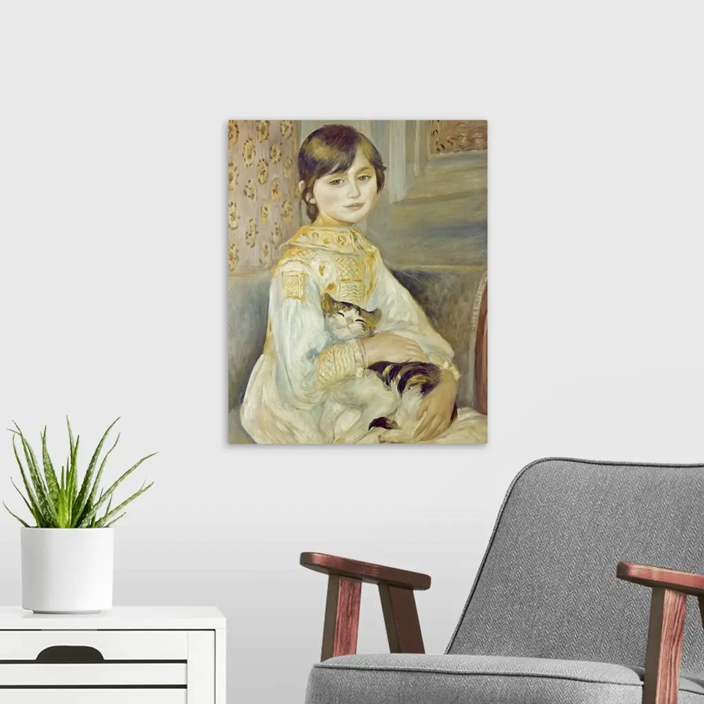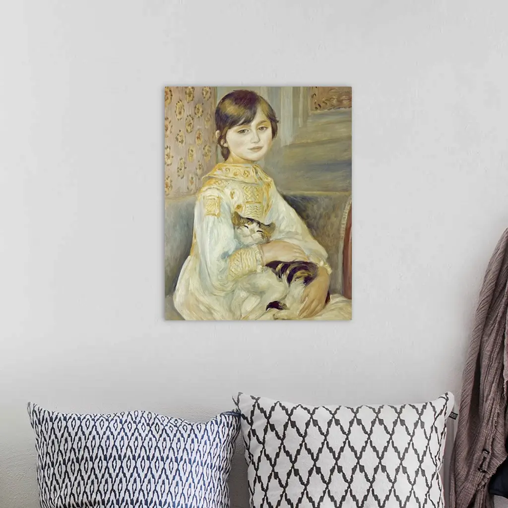 Classic artwork of a small girl as she sits on a couch with her hands wrapped around the cat on her lap.