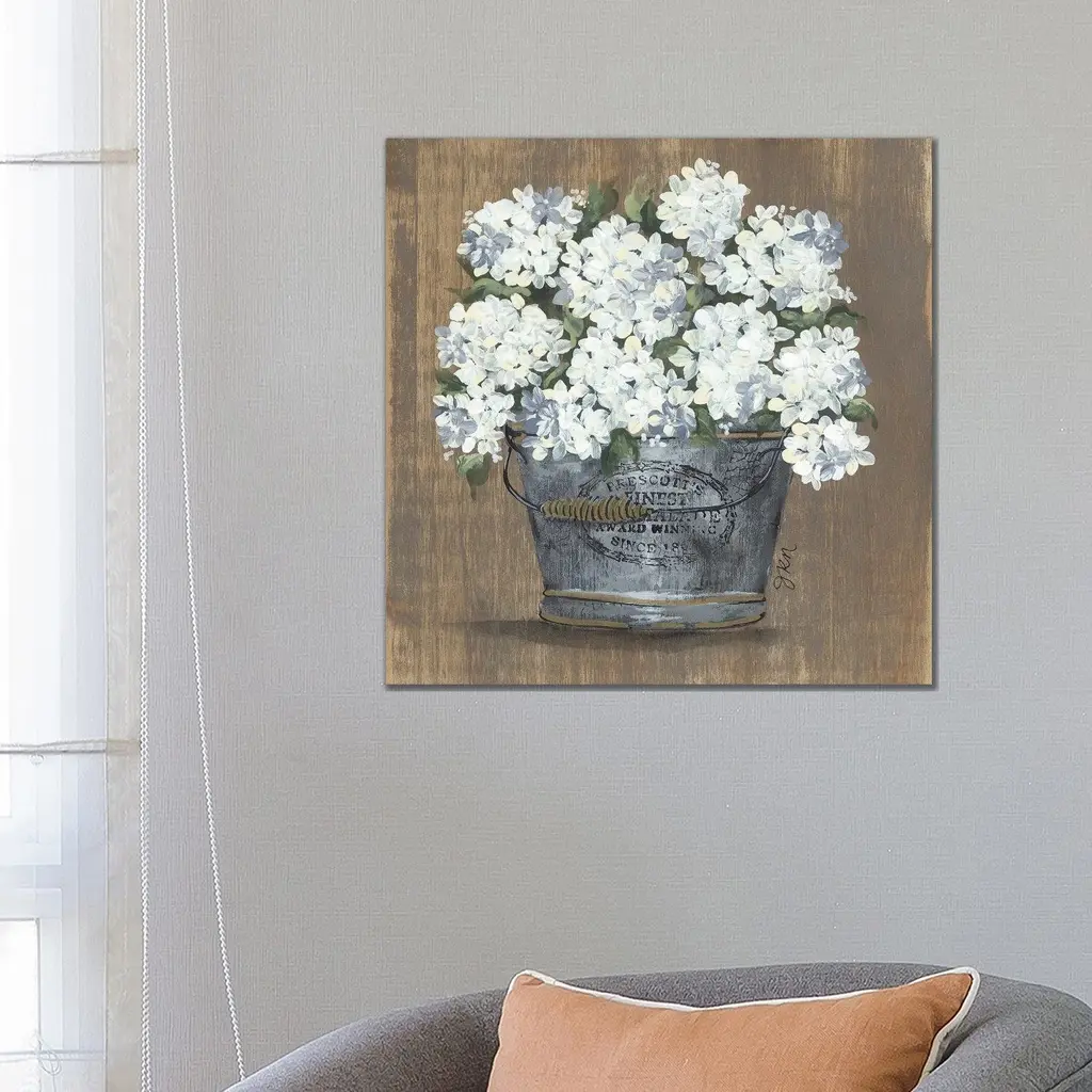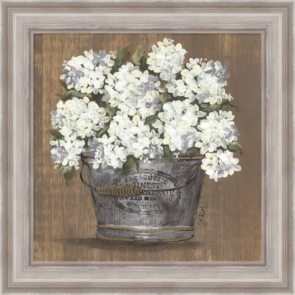 Heavenly Hydrangeas I by Julie Norkus is a high quality piece of framed artwork. The finished size of this piece is 20" X 20". It has a Weathered White Distressed frame and is finished with high quality Acrylic Plexiglass. 100% Satisfaction Guaranteed.