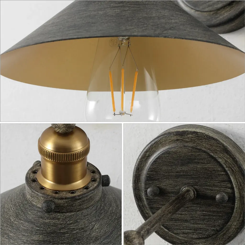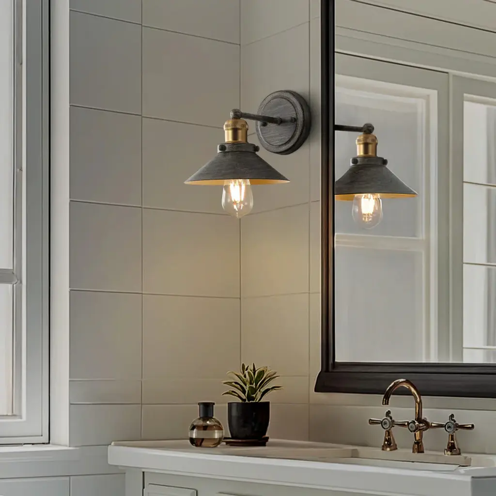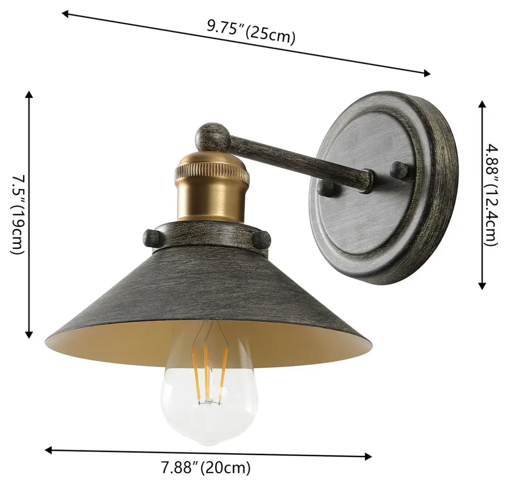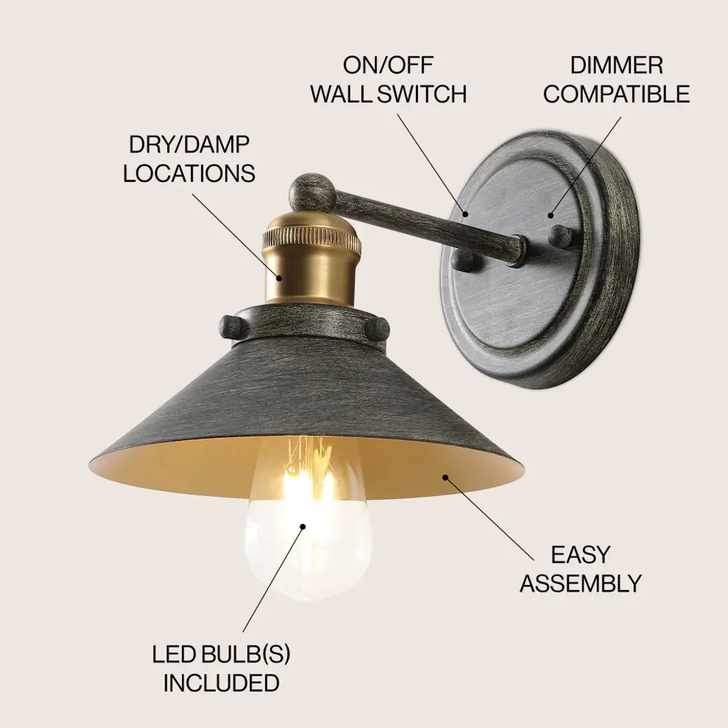 Like a classic barn light but in a modern shape and smaller scale, this classic design features a metal cone shade that conceals the top half of the bulb -- perfect for a clean, industrial look. In metal finish, this sconce is perfectly at home above a bathroom mirror or as extra lighting in kitchens, where your hardware truly shines. Also available in multi-light configurations, the geometric shape adds elegant interest to any space.-A metal cone shade defines this modern industrial bathroom light -Rustic dark gray finished cone shades add industrial charm to the classic barn-style light -Takes 1 bulb and compatible with 9W LED or 40W Type "A" or 13W CFL-Eco-friendly 4W LED bulb included-As this fixture must be hardwired, we recommend a professional electrician manage installation-Color Temperature: 2700K-CRI: 80-Color: Rustic Dark Gray/Brass Gold-Body Material: Metal-Base Material: Metal-Finial Material: No Finial-Finial Color: No Finial-Harp Color: No Harp-Includes: One (1) lamp-Assembly Required-Lamp: 7.5 inches high x 7.88 inches wide x 9.75 inches deep-Shade: 2.5 inches high x 7.88 inches wide x 7.88 inches deepYou see a lamp.We see a decorative work of art.A perfectly curved shade casts a dramatic shadow on a floor. Compatible with LED lightbulbs: as easy on the environment as they are on the eyes. The JONATHAN Y Lighting collection considers every detail from impeccably sourced materials to designer styling. And our prices are so attractive, we''ve transformed a functional necessity into a fashion accessory.JONATHAN Y Lighting - a fashion revolution in home decor.