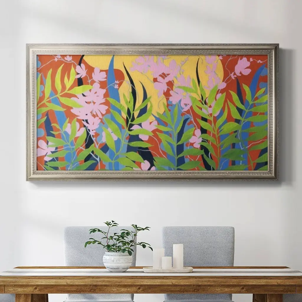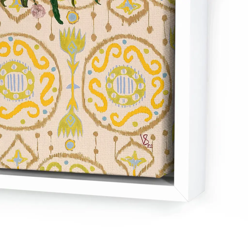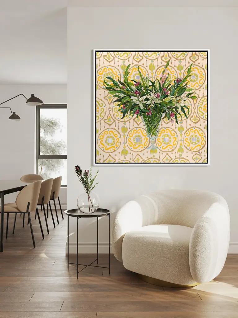 DESCRIPTION: Juma Lilies by Venetia Syms in White Frame, Art Print on Canvas Edition of 100. SPECIFICATIONS: Type: Giclée Art Print on Matte Canvas. Overall Size (in): 40x40. Image Size (in): 38.5x38.5. Orientation: Vertical. Flush/Float/Matted: Float. Frame Color: White. Hanging Hardware: Picture Perfect. FRAMING: Each art work arrives framed and ready to hang. We use handmade frames with a plexiglass glazing front, because it offers less glare than standard glass. At this time, we only offer framed prints. ARTIST BIO: Venetia Syms (b.1990) studied classical portraiture at Charles Cecil Studios in Florence, Italy and went on to University College Falmouth, U.K and the Heatherley’s School of Fine Art in London. Venetia now paints colourful impasto paintings inspired by the natural world from her studio in London. Her contemporary still life paintings are a modern interpretation of a traditional idea by setting flowers in front of patterned fabrics. “I'm obsessed with colourful textile design; I paint interpretations of my favourite fabrics in the background of my paintings. I particularly love Suzani inspired designs which remind me of my travels across central Asia along the silk road allowing my paintings to take you to another place. Using a palette knife I stroke indulgent layers of oil paint to capture the life and colour of cut flowers.” Venetia’s paintings have been exhibited across the U.K and in Amsterdam. She had an exhibition at the Chelsea Flower Show 2022 & 2021.