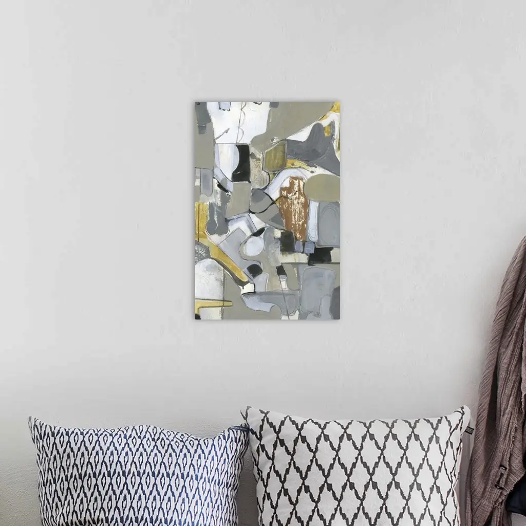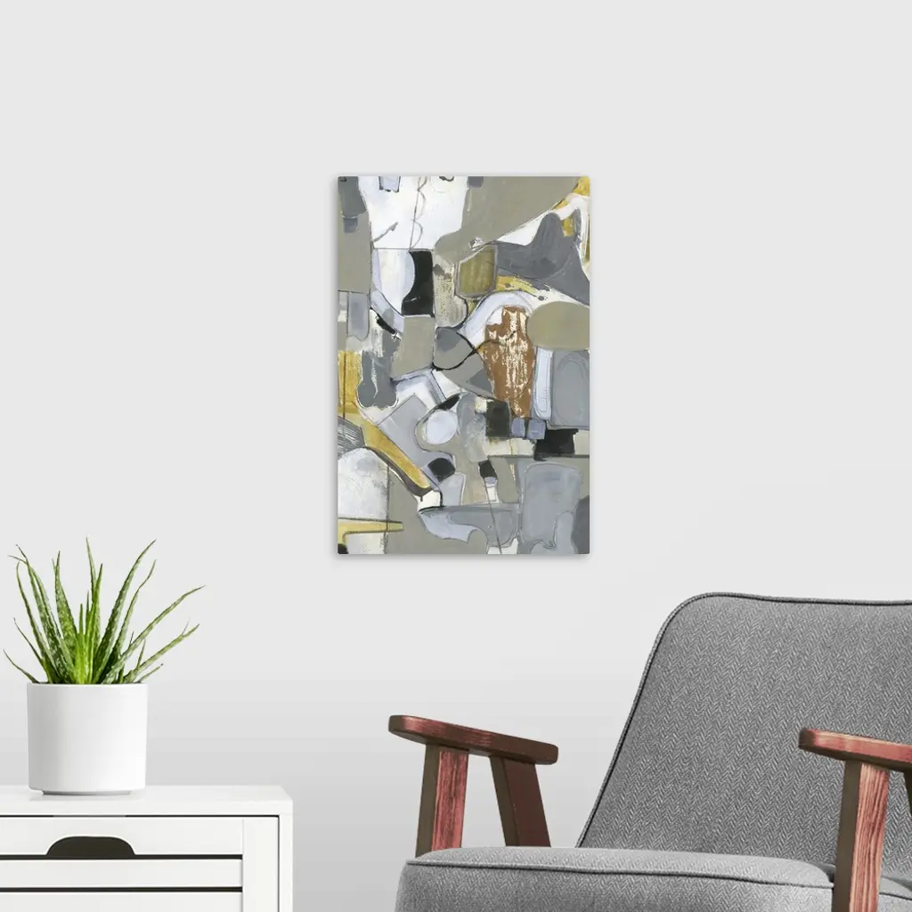 Abstract contemporary painting in shades of grey and brown, contrasting with pops of white.