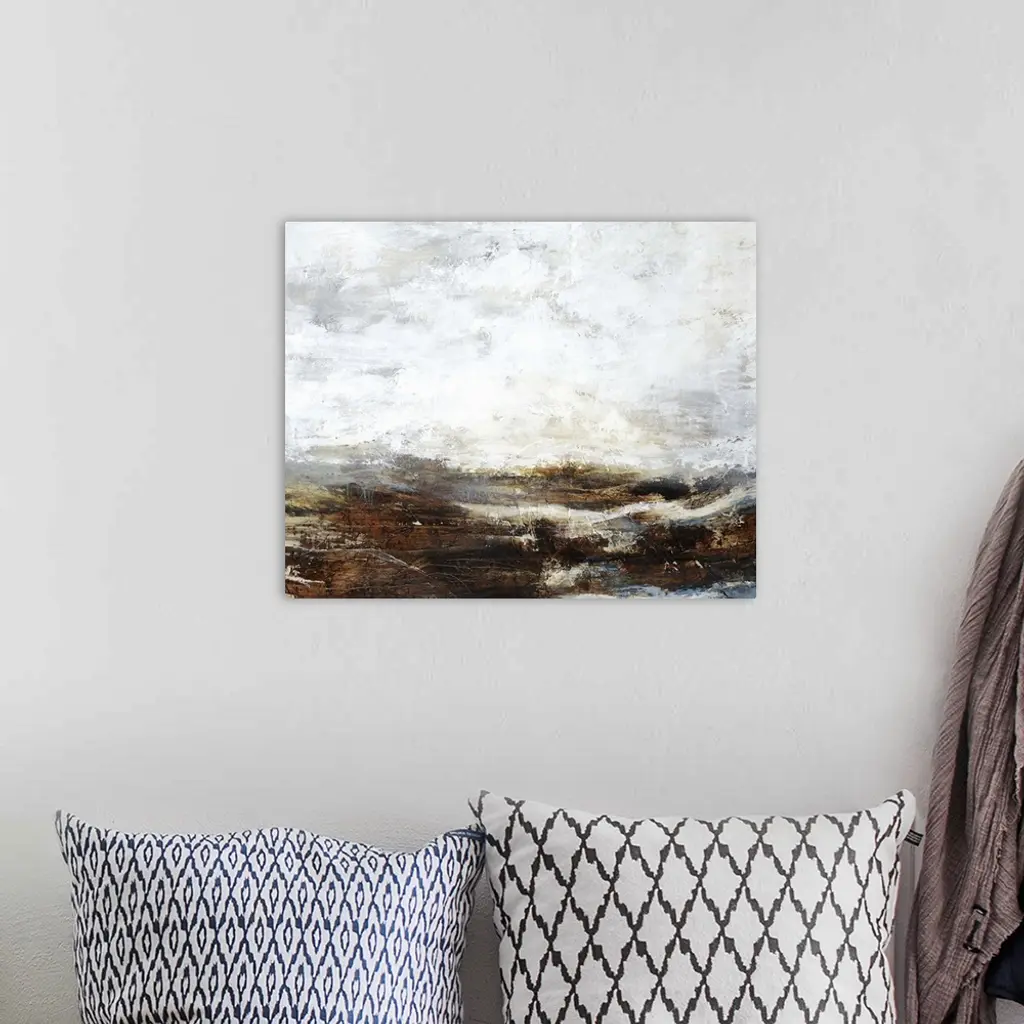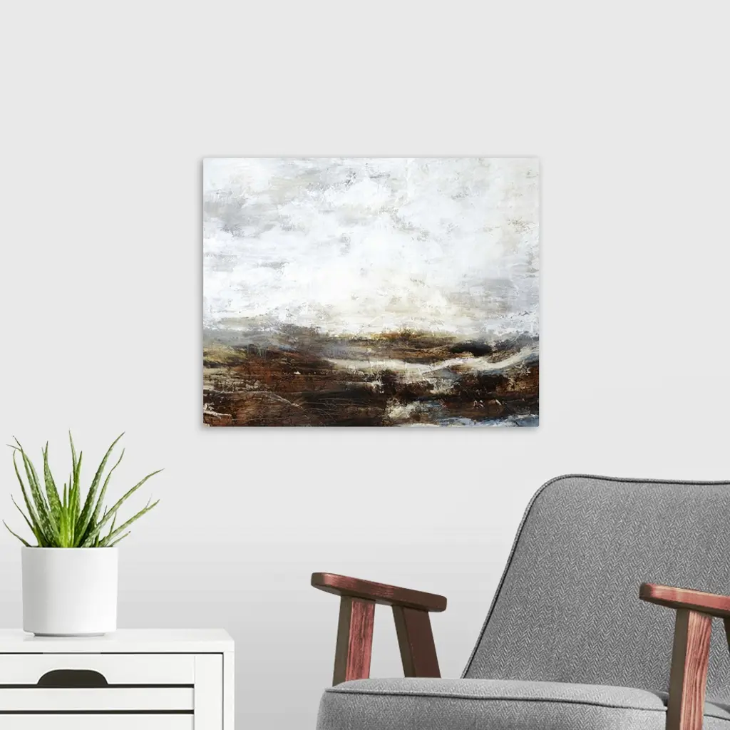 Contemporary painting of a landscape under a heavy fog shrouding the mountains in the distance.