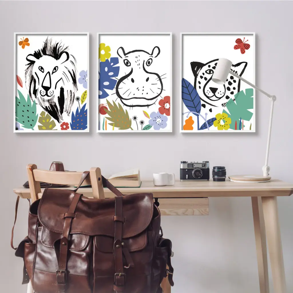 Jungle Animal Kingdom Colorful Kids Pet Illustration, 3Pc, Each 24 X 30