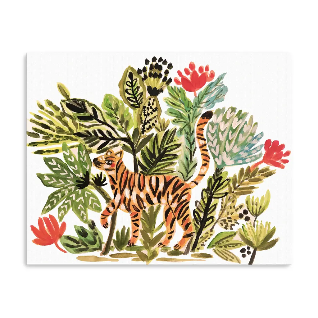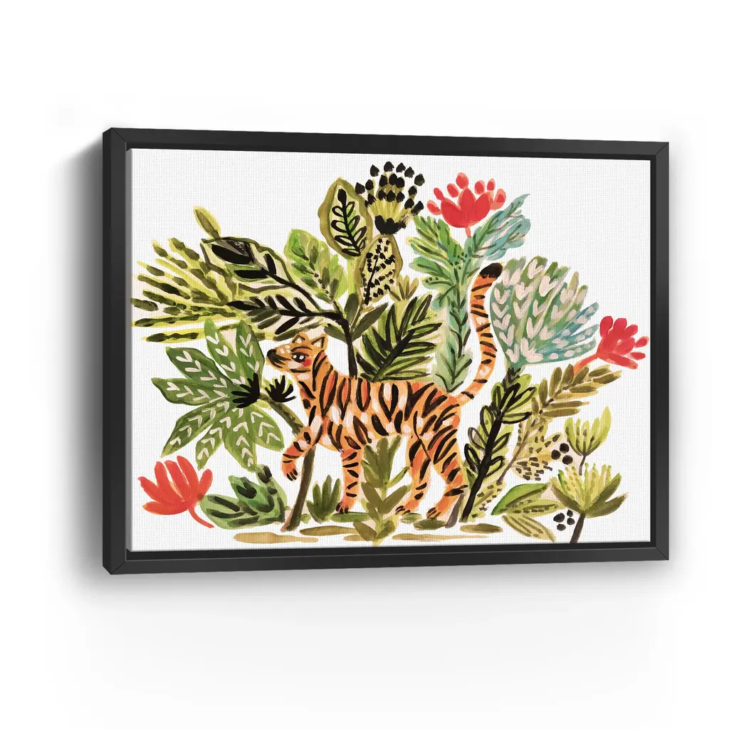 Enhance your living space with this captivating "Jungle Cat Garden Walk" canvas art by Karen Fields. Featuring a rich palette of green tones and diverse elements, this artwork adds depth and intrigue to any room. The dynamic composition and vibrant hues create a striking visual experience, making it a perfect statement piece for both contemporary and classic interiors. Available in black frame, dark walnut frame, oak frame, or as a wrapped canvas. Our Gallery Wrap Canvas Prints are proudly assembled with high quality materials in California, USA. Each piece is printed on a thick, archival grade canvas using Giclee technology. It is then hand-stretched by our experienced artisans over solid wood bars, which will not warp over time. The final product is a piece personally crafted for you to confidently display on your wall. Care and Assembly: Ensure that the location of your piece has little to no exposure to heat, sunlight, and moisture. Wipe clean, only if needed. Each piece includes a sawtooth hanger to hang on your wall horizontally.