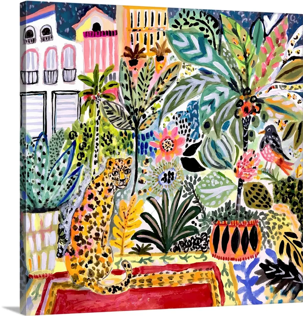 Enhance your living space with this captivating "Jungle Cat In Town" canvas art by Karen Fields. Featuring a rich palette of green tones and diverse elements, this artwork adds depth and intrigue to any room. The dynamic composition and vibrant hues create a striking visual experience, making it a perfect statement piece for both contemporary and classic interiors. Available in black frame, dark walnut frame, oak frame, or as a wrapped canvas. Our Gallery Wrap Canvas Prints are proudly assembled with high quality materials in California, USA. Each piece is printed on a thick, archival grade canvas using Giclee technology. It is then hand-stretched by our experienced artisans over solid wood bars, which will not warp over time. The final product is a piece personally crafted for you to confidently display on your wall. Care and Assembly: Ensure that the location of your piece has little to no exposure to heat, sunlight, and moisture. Wipe clean, only if needed. Each piece includes a sawtooth hanger to hang on your wall horizontally.