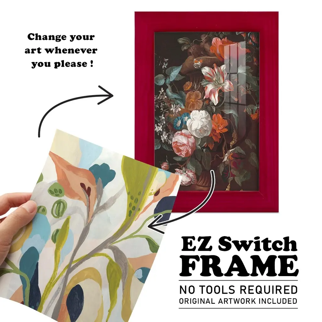 Jungle Jewels IV -EZ SWITCH Framed Print w/glass-Cherry Red A delightful, framed print. Featuring a solid wood frame with real wood glass. This premium print is giclee quality. In addition, every frame features a removable back and table top stand. This allows you to change your art in the future or to just stand the art on a table for a new look. We are sure you'll enjoy our new series of EZ SWITCH Framed Art. Solid Wood Frame Real Glass Removable / Replaceable Art Built in Tabletop Stand Sizes range from 4x6 up to 12x15 - buy just one or pair them up as sets as you see fit.