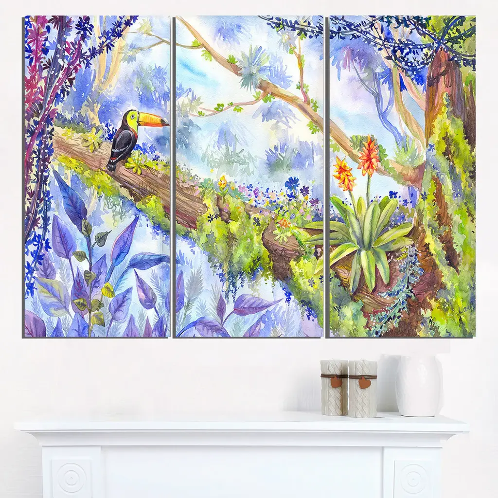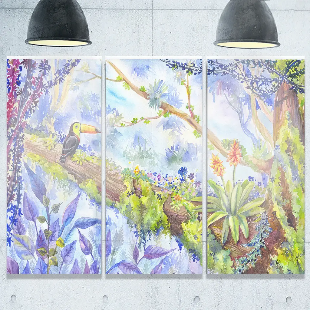 "Jungle With Bird Toucan On Tree" Metal Wall Landscape, 3 Panels, 36"x28"