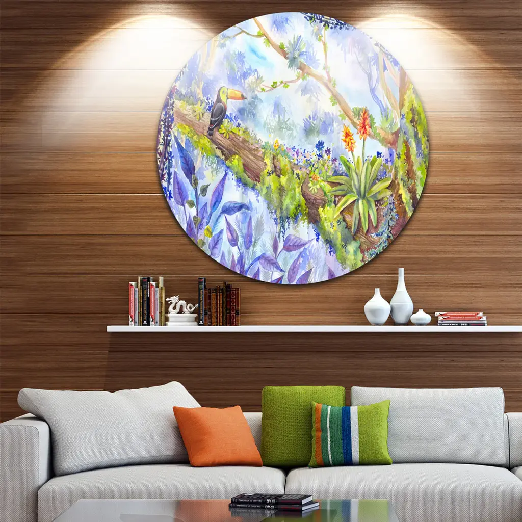 Bring Contemporary Abstraction to your home with this large Circle Metal wall art. This Jungle with Bird Toucan on Tree Metal Artwork makes it the focal point of any room or office. - White Gloss Coating ensures colors are extra vibrant with light reflection.- Aluminum grade Sheet Metal with 1 inch mounting frame on the back giving the illusion that the artwork is floating on the wall..- Mounting Brackets are included along with instructions.- High Quality Digital images are created directly into a glossy aluminum panel producing a stunning and captivating print into the glossy finish of the metal.- Water, Fire and Scratch resistant HD Aluminum panels.- Looks better than any photo paper and guaranteed to last at least 20 years- Easy to clean with a microfiber cloth. Colors are far superior to regular Canvas Art. - Easy to Hang