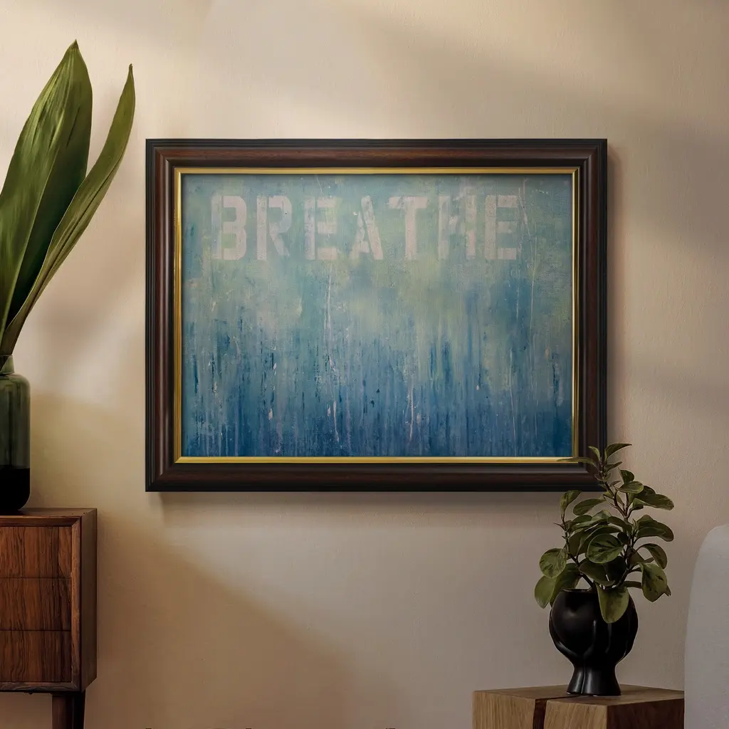 Just Breathe Premium Framed Canvas- Ready to Hang A Premium Framed Canvas created to last. Framed in distressed wood and available in an array of sizes and colors Featuring a beveled a solid wood stretcher bar, each piece comes ready to hand 3 SIZES AVAILABLE 16''X20'' - Overall Size 18'X27'' - Overall Size 24''x36'' - Overall Size Each piece is made to order. Each piece comes with hanging hardware. Made in the USA Ready to Hang Giclee Paper Print Acrylic Glass Beveled Matt Board