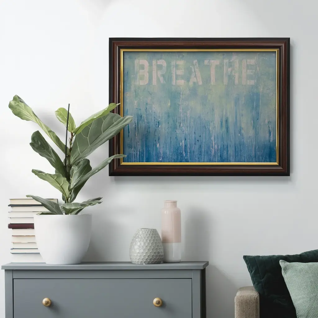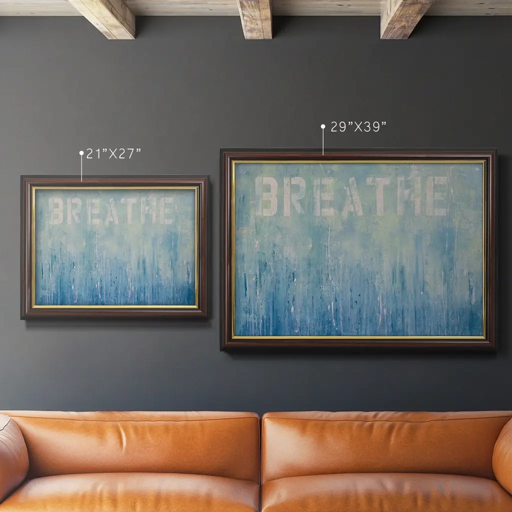 Just Breathe Premium Framed Canvas- Ready to Hang A Premium Framed Canvas created to last. Framed in distressed wood and available in an array of sizes and colors Featuring a beveled a solid wood stretcher bar, each piece comes ready to hand 3 SIZES AVAILABLE 16''X20'' - Overall Size 18'X27'' - Overall Size 24''x36'' - Overall Size Each piece is made to order. Each piece comes with hanging hardware. Made in the USA Ready to Hang Giclee Paper Print Acrylic Glass Beveled Matt Board