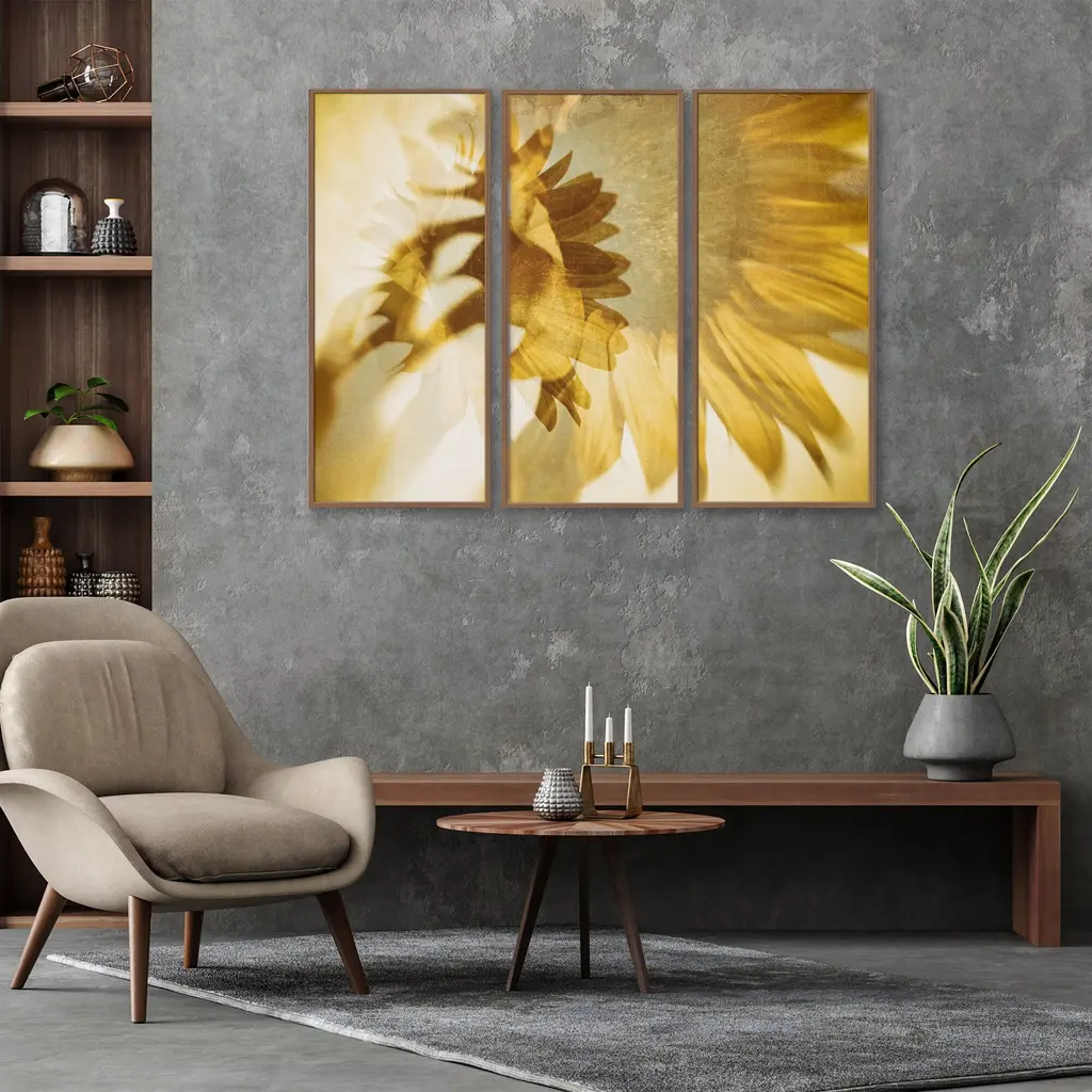 Add fresh florals to your space with Sherin Abdou's "Just like the Sun" framed print three-piece wall art set. The delicate sunflower with exposure in shades of yellow and brown add a feminine touch to any room. Handcrafted in Chattanooga, Tennessee, by Ready2HangArt using a locally sourced artist print, finished with a rear hanger for simple installation.