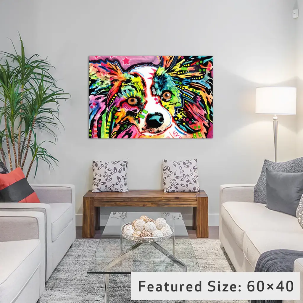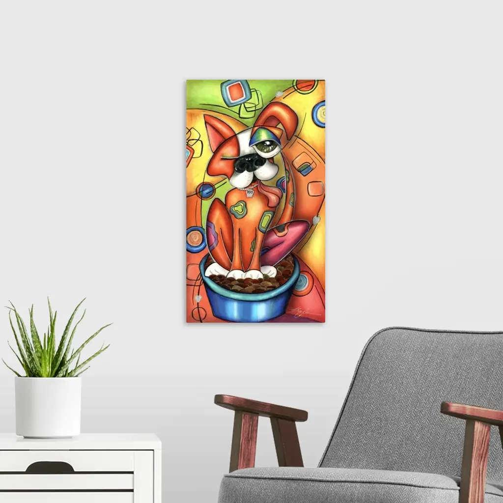 Vertical contemporary artwork in the style of cubism of a dog sitting in a bowl of food in bold colors.