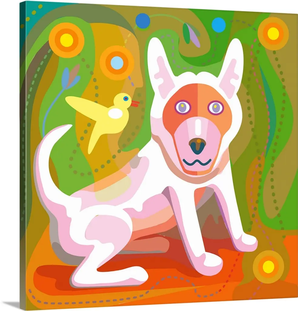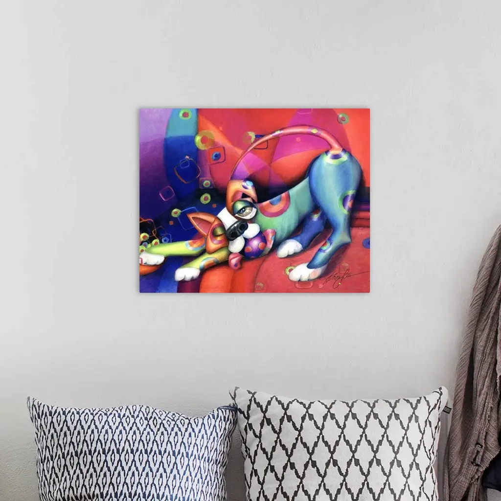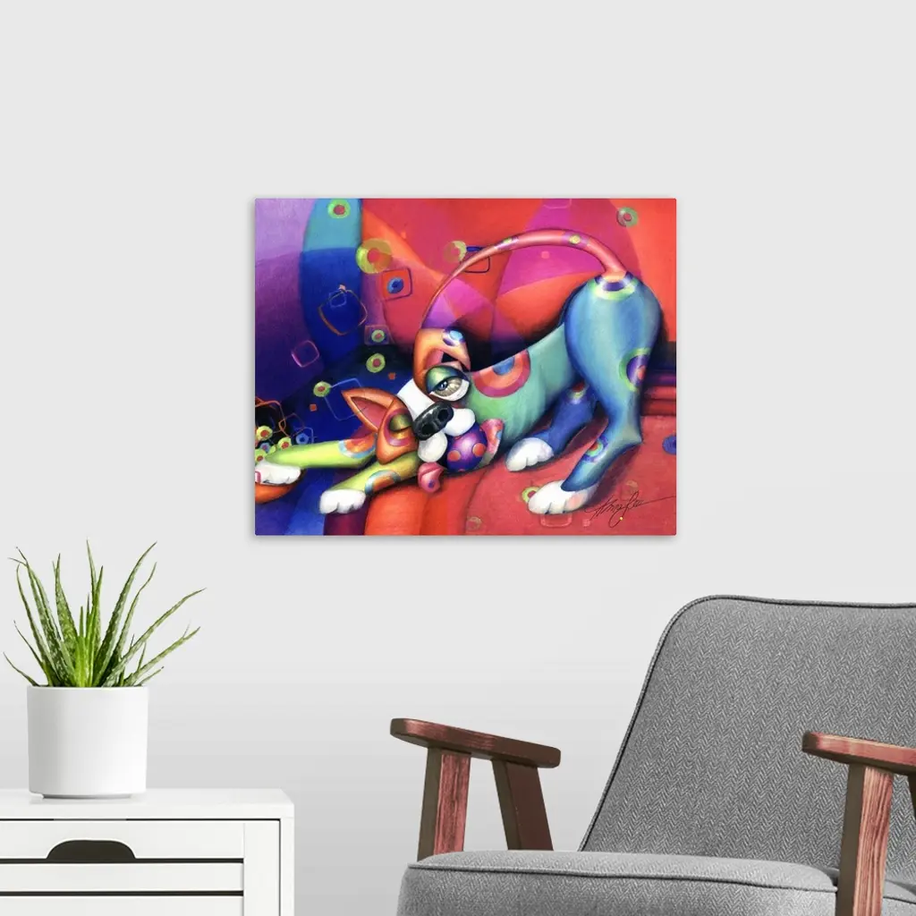 Contemporary artwork in the style of cubism of a stretching dog with a ball in bold colors.
