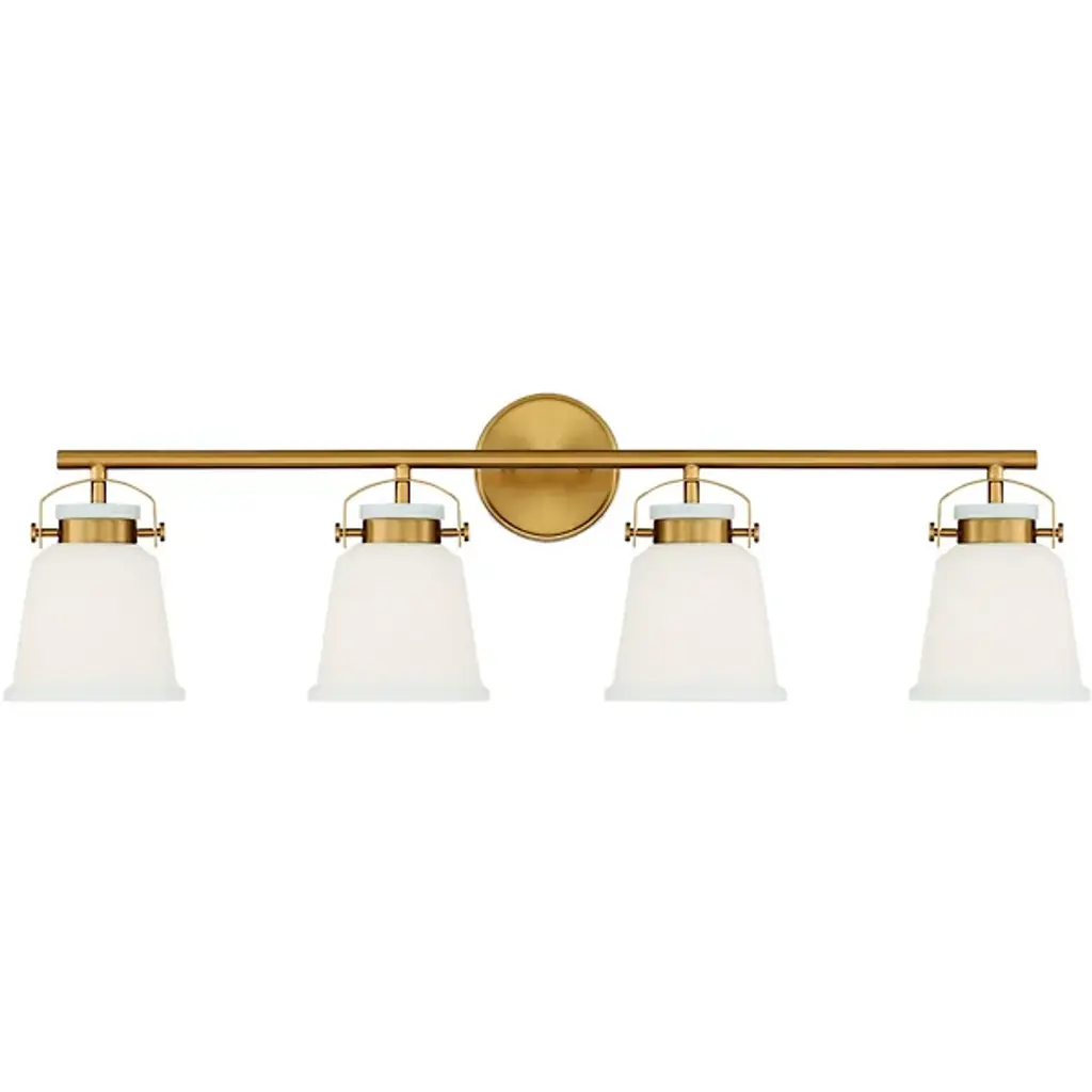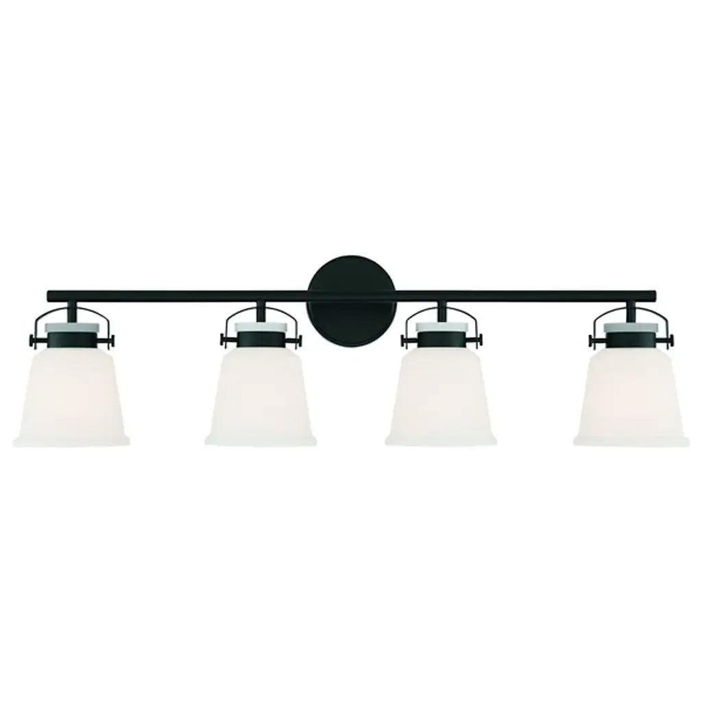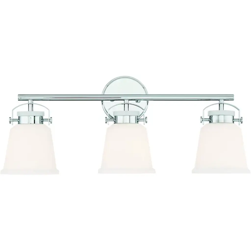 Bring a chic and decorative look to your bathroom with the Kaden Vanity Light by Savoy House. A metallic rod rests along a backplate secured to your wall. Hanging from this rod are numerous Opal Shades which house bulbs that give your room its luminescence. Placement above your bathroom mirror allows light to diffuse effortlessly from overhead. The eye is drawn to the distinctive bell shape embodied in the fixture’s design.