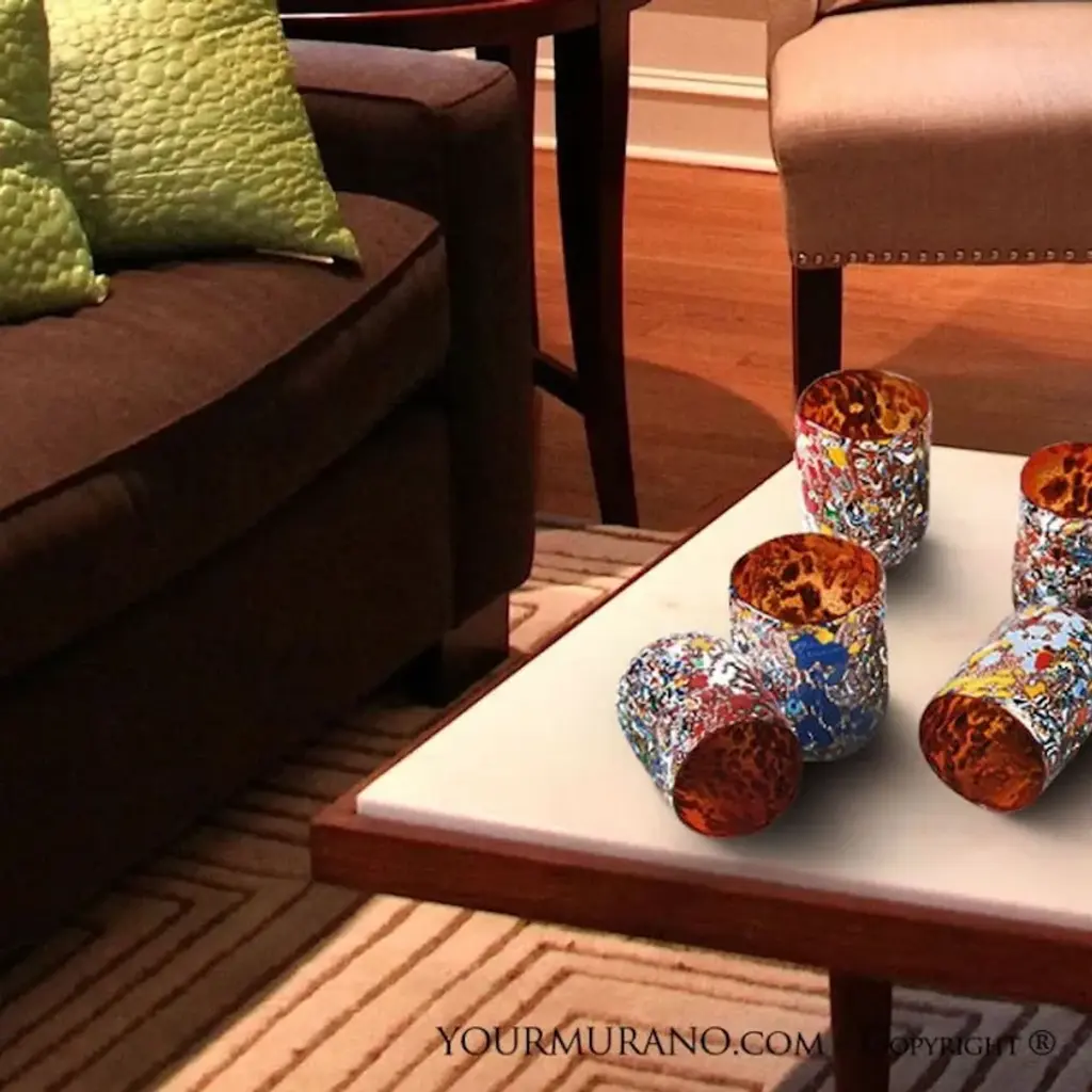 KAIA RED is a set of typical Murano glasses, inspired by the traditional "Goti de fornasa", with orange glass, murrine and silver leaf details. These hand-crafted artworks, realized by expert glassmakers, are the perfect decorative elements for your house, or a unique way to add color to your dinner parties.Whether you have a classic home décor or a more modern one, whether you need colorful glasses to give a creative twist to your dining room or you are looking for a more sophisticated option to add an elegant touch to your dining table, you will certainly love our Murano glass tumblers, also known as “goti”. These precious Murano glasses are carefully handmade by expert glassmakers in the heart of the Venetian lagoon, they are unique collectible items to impress all your guests! All products are handcrafted and prime production quality. Insubstantial variations in shape, size, colour, small imperfections in the glass are not considered defects; they are inevitable and are typical of manual production of the glass and characterize handcrafted production.