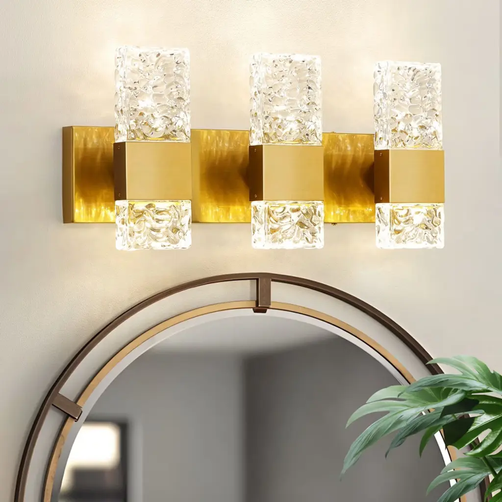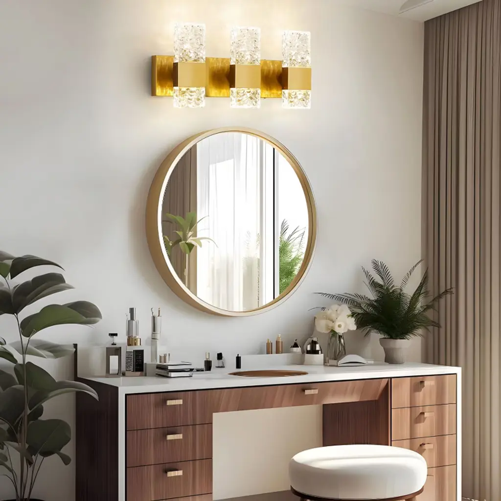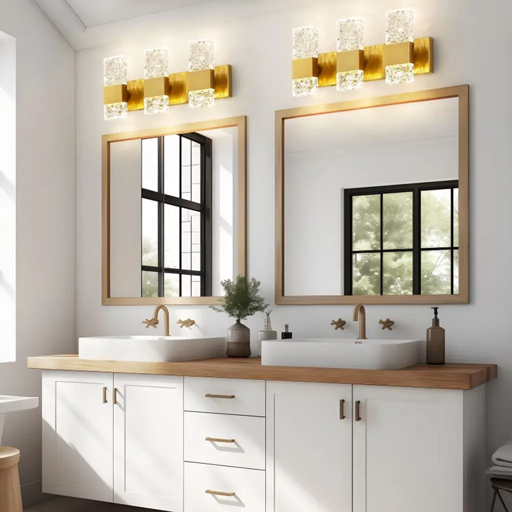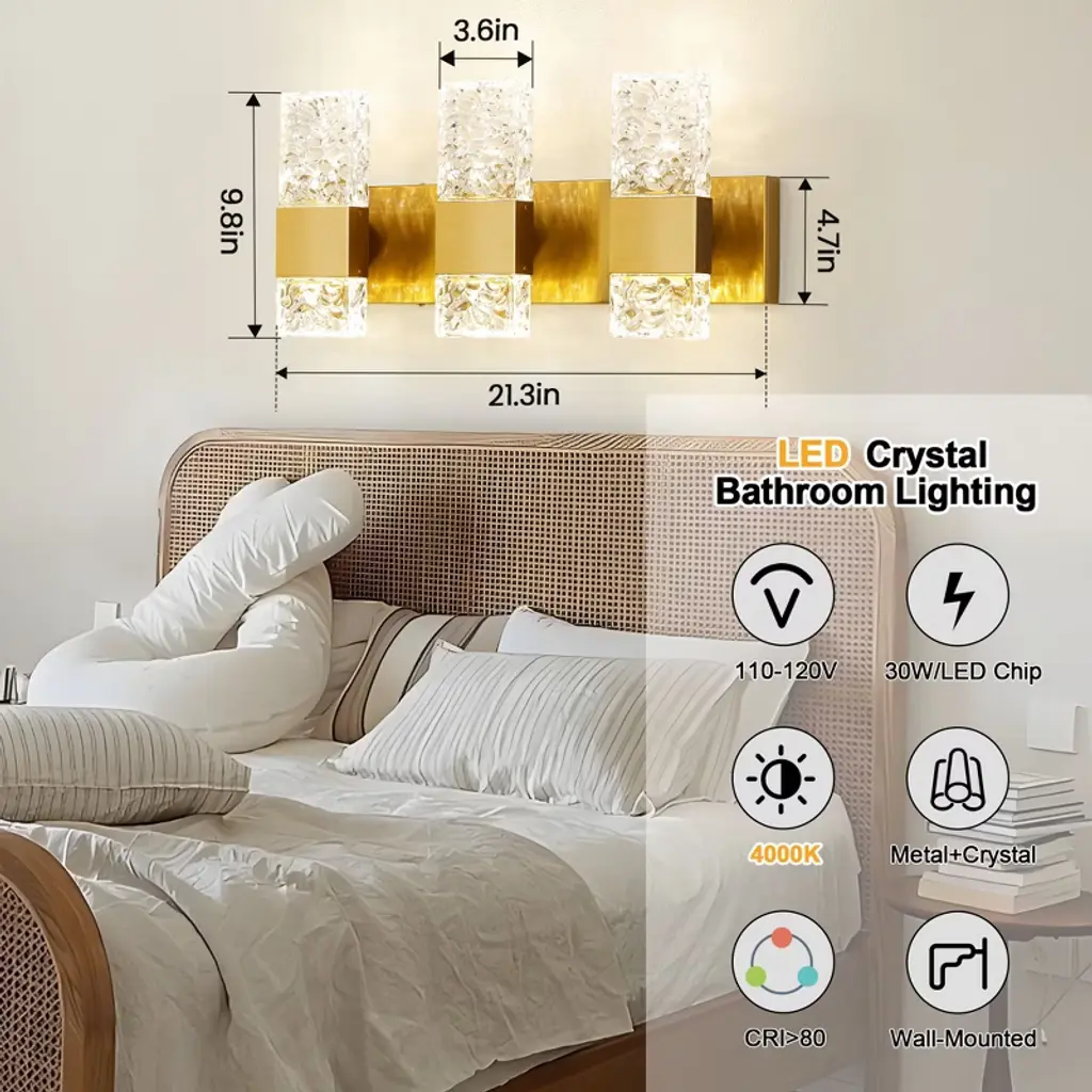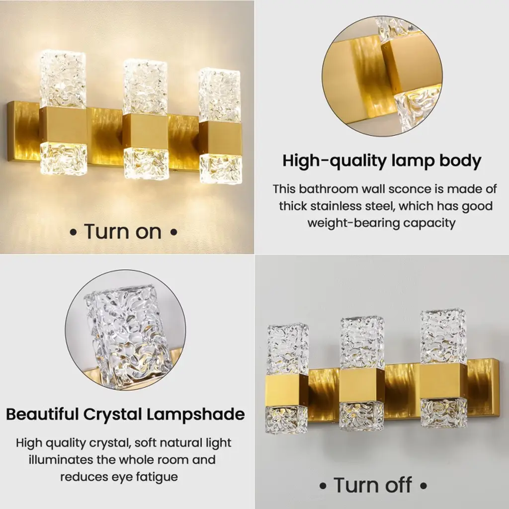Bring modern luxury to your bathroom with this crystal LED vanity light. Featuring 8 corrugated crystals that sparkle like ice cubes, this fixture diffuses light beautifully while adding a touch of sophistication. The integrated 40W LED provides 2400 lumens of bright, energy-saving illumination with a natural 4000K glow, perfect for daily routines like makeup or shaving. Built with a durable stainless steel gold-plated base and ETL certification, this fixture ensures both style and safety. Whether in the bathroom, living room, or bedroom, its timeless design elevates any interior décor.