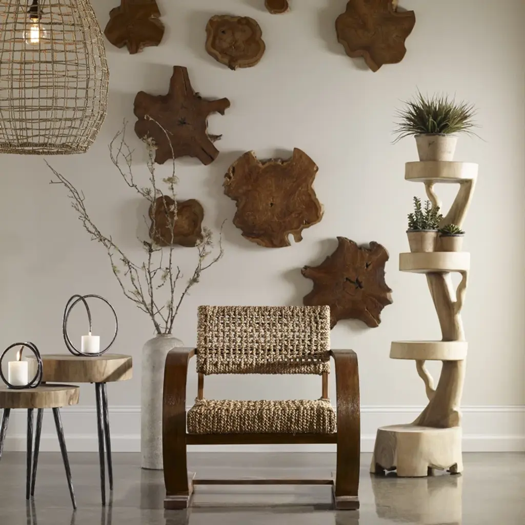 Deeply grained cross sections of natural teak wood with a light honey glazing. Panels may be hung or used as tabletop accessories. Sizes and grain pattern may vary due to the authentic nature.