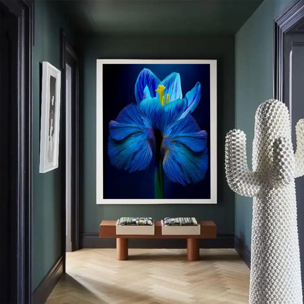 Color photograph of male betta fish swimming with a blue tulip. Printed on Archival Fine Art Paper.