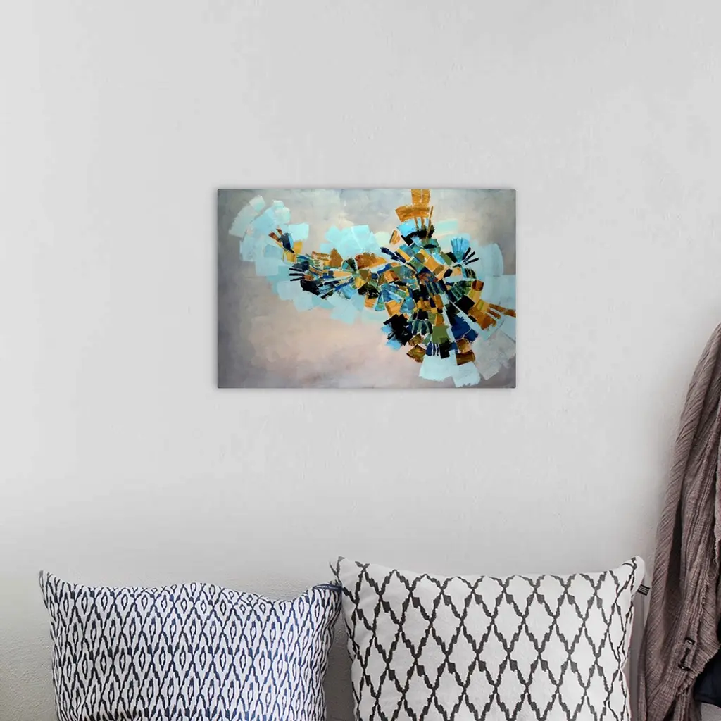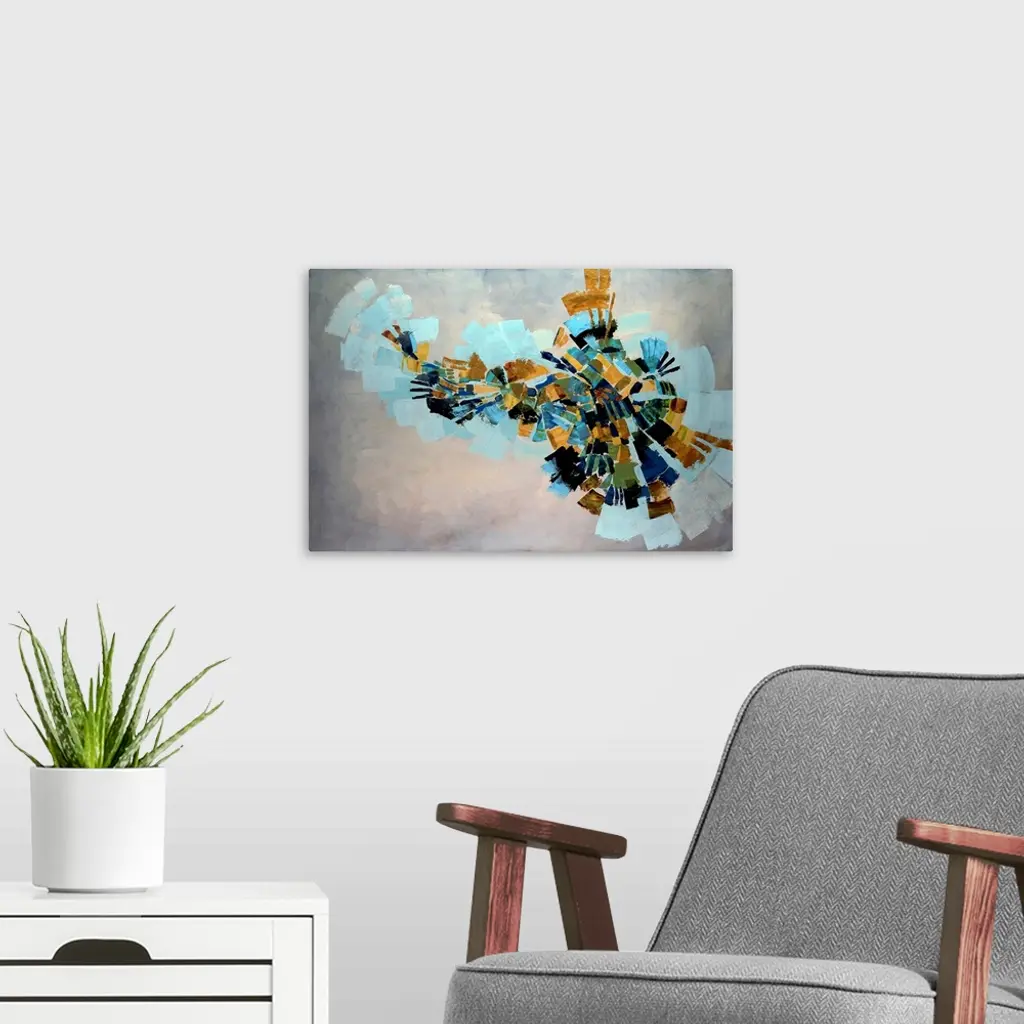 Fan like shapes radiate outward in this abstract painting on a horizontal wall hanging for the office of home.