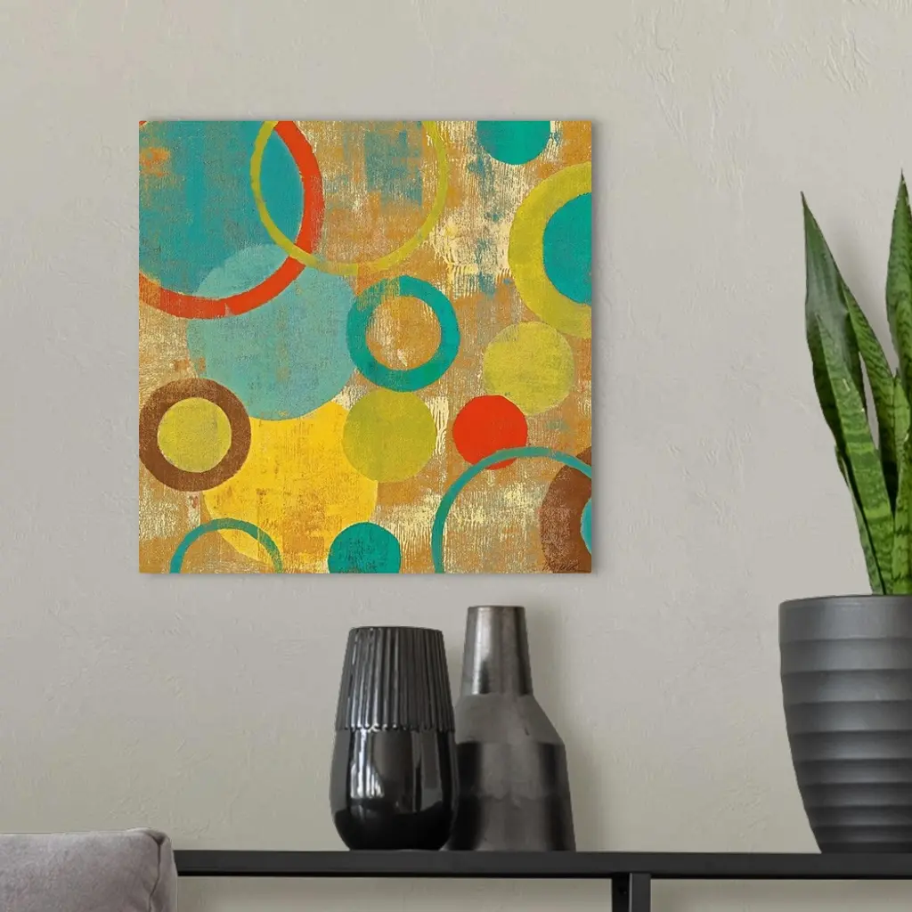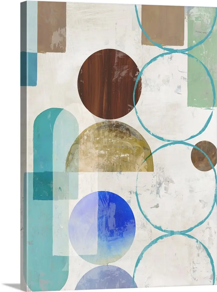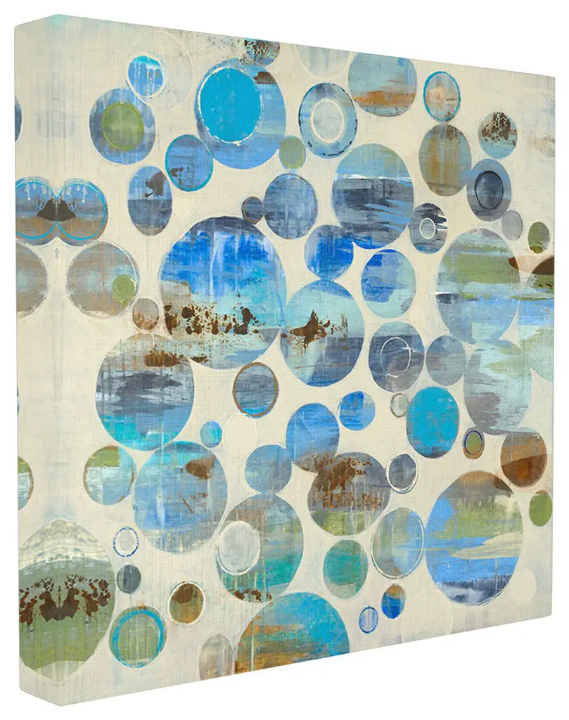 Contemporary painting of overlapping circles and loops varying in color and size on an abstract background.