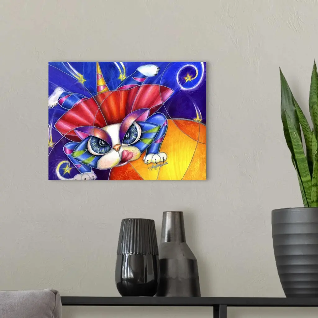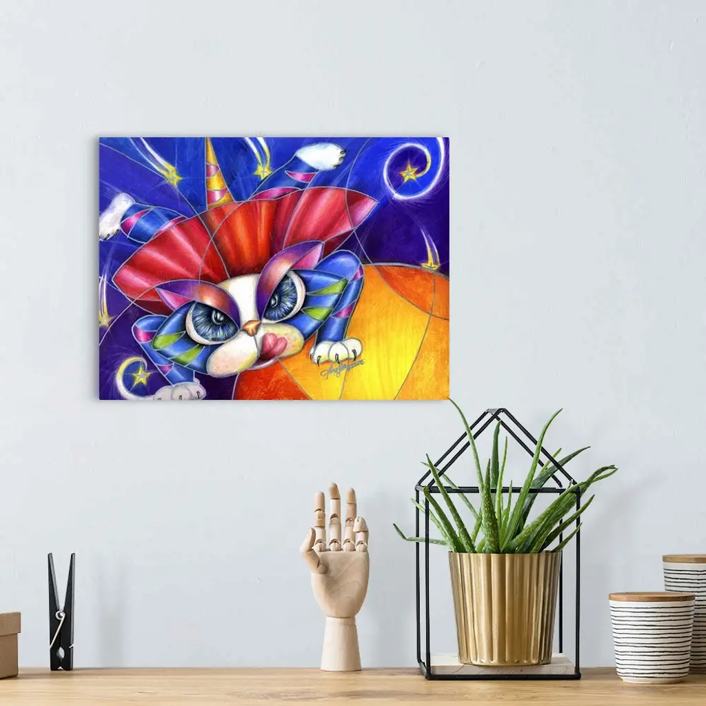 Contemporary artwork in the style of cubism of a stretching cat in bold colors.