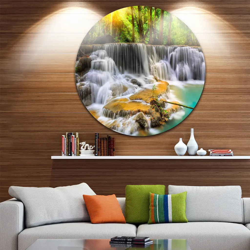 Bring Contemporary Abstraction to your home with this large Circle Metal wall art. This Kanchanaburi Province Waterfall Metal Artwork makes it the focal point of any room or office. - White Gloss Coating ensures colors are extra vibrant with light reflection.- Aluminum grade Sheet Metal with 1 inch mounting frame on the back giving the illusion that the artwork is floating on the wall..- Mounting Brackets are included along with instructions.- High Quality Digital images are created directly into a glossy aluminum panel producing a stunning and captivating print into the glossy finish of the metal.- Water, Fire and Scratch resistant HD Aluminum panels.- Looks better than any photo paper and guaranteed to last at least 20 years- Easy to clean with a microfiber cloth. Colors are far superior to regular Canvas Art. - Easy to Hang