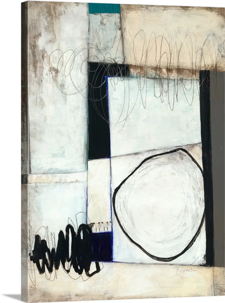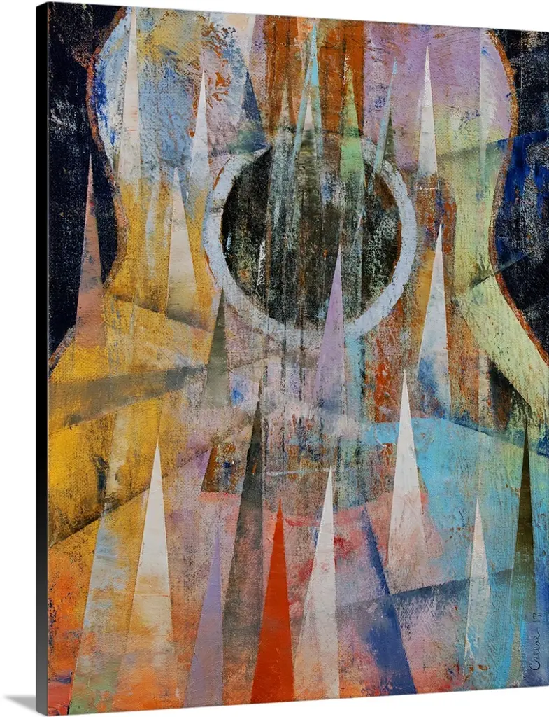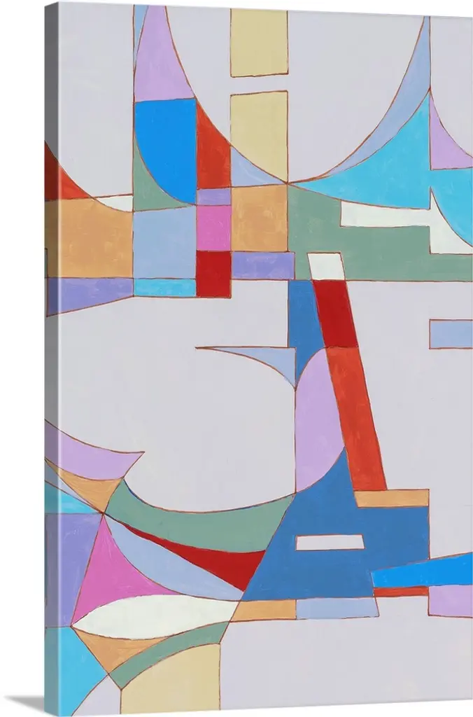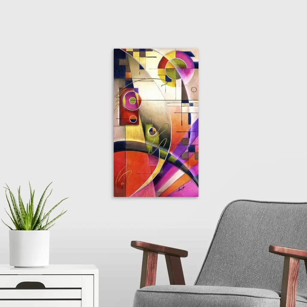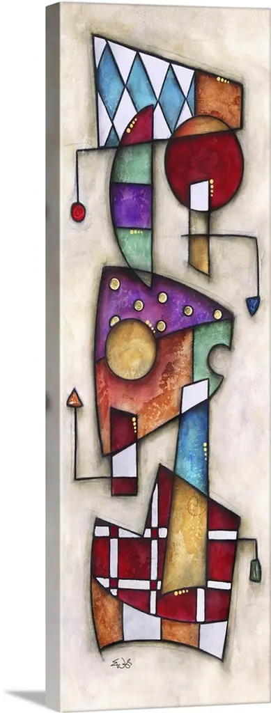 Vertical abstract painting of vibrant colored shapes in circles and triangles.