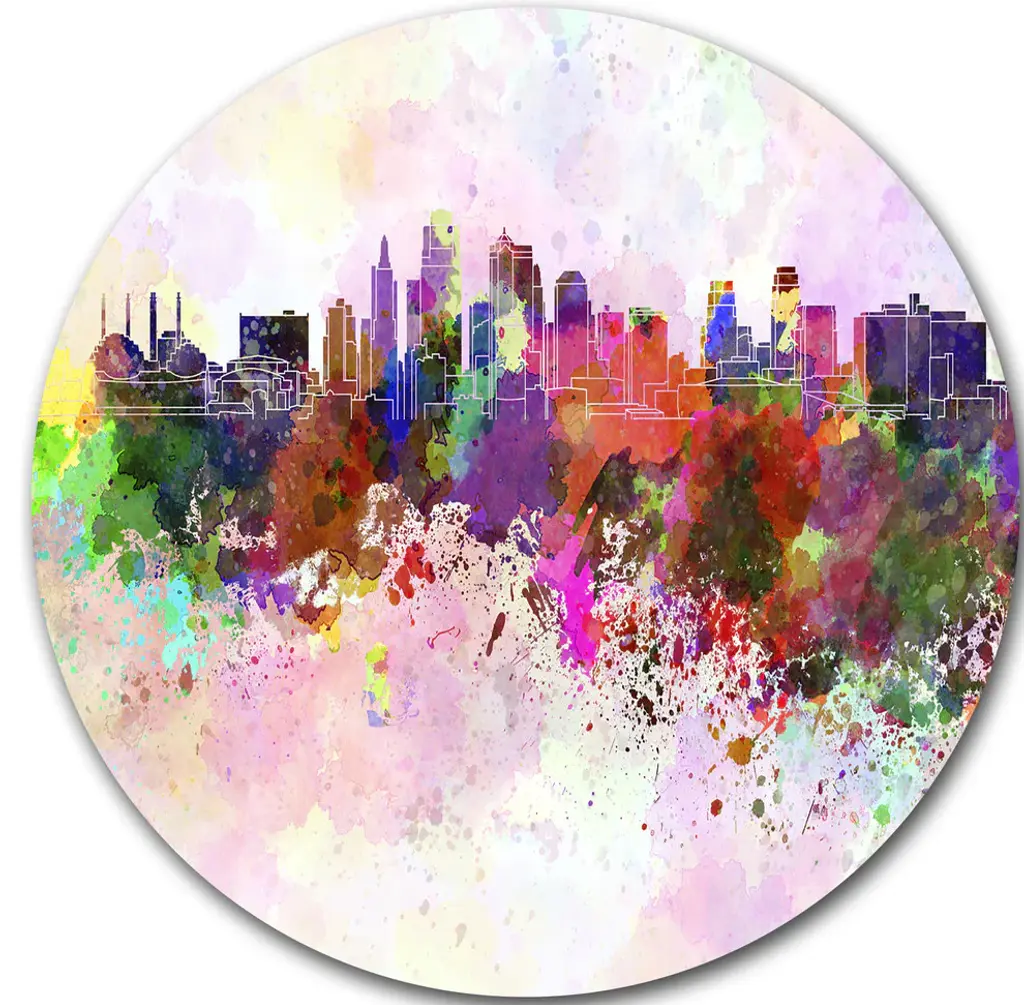 Bring Contemporary Abstraction to your home with this large Circle Metal wall art. This Kansas City Skyline Metal Artwork makes it the focal point of any room or office. - White Gloss Coating ensures colors are extra vibrant with light reflection.- Aluminum grade Sheet Metal with 1 inch mounting frame on the back giving the illusion that the artwork is floating on the wall..- Mounting Brackets are included along with instructions.- High Quality Digital images are created directly into a glossy aluminum panel producing a stunning and captivating print into the glossy finish of the metal.- Water, Fire and Scratch resistant HD Aluminum panels.- Looks better than any photo paper and guaranteed to last at least 20 years- Easy to clean with a microfiber cloth. Colors are far superior to regular Canvas Art. - Easy to Hang