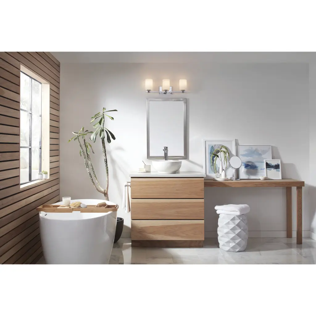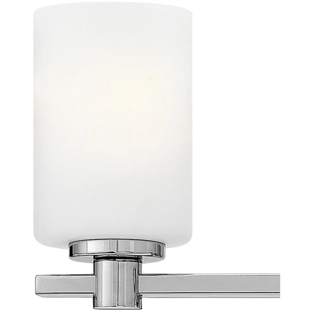 Karlie's clean design is transitional in style and will complement a variety of decor. Featuring precision die-cast cups and cylindrical, etched opal glass, it is available in Brushed Nickel and Chrome.