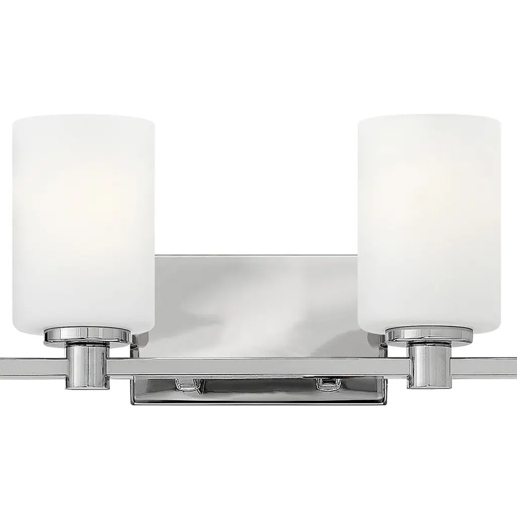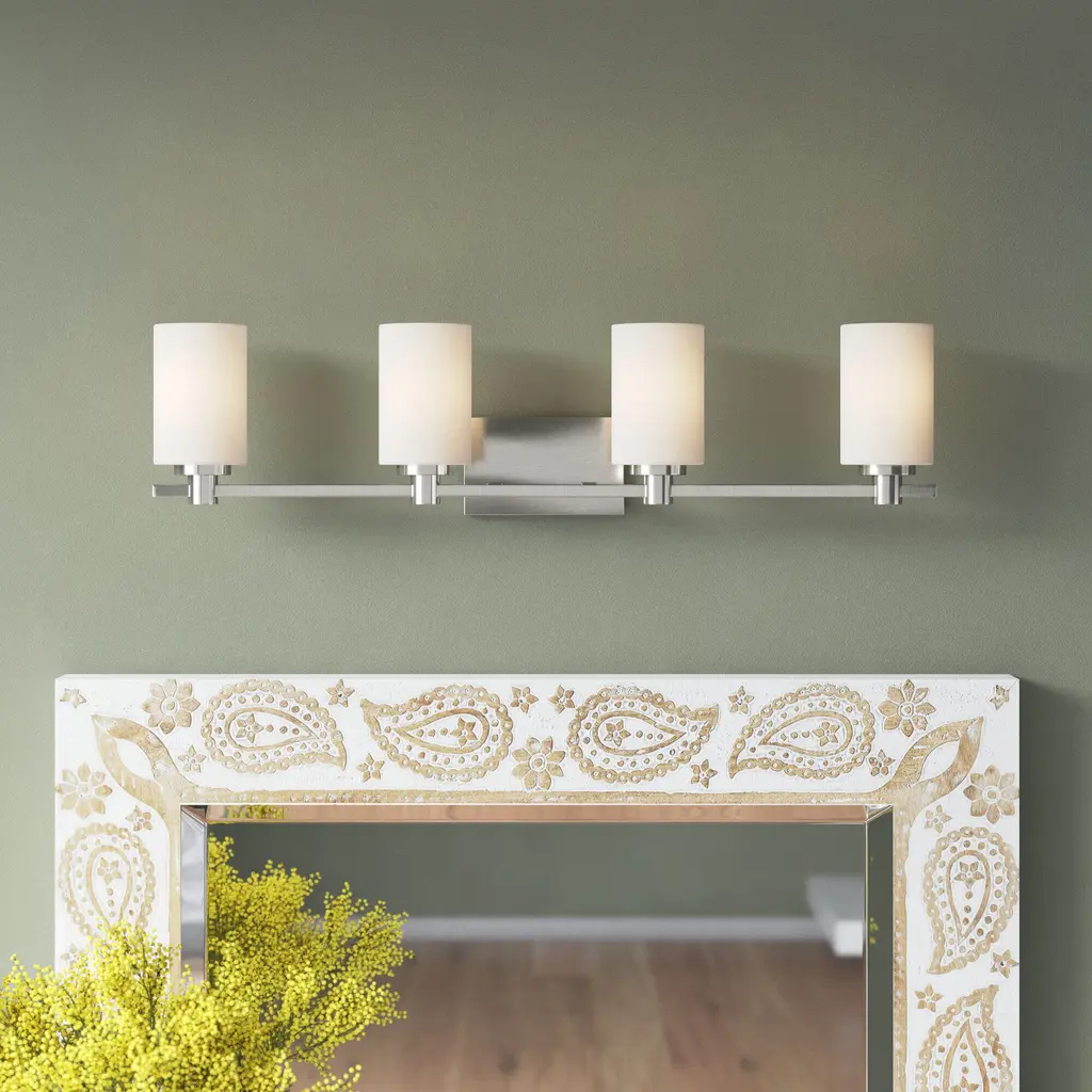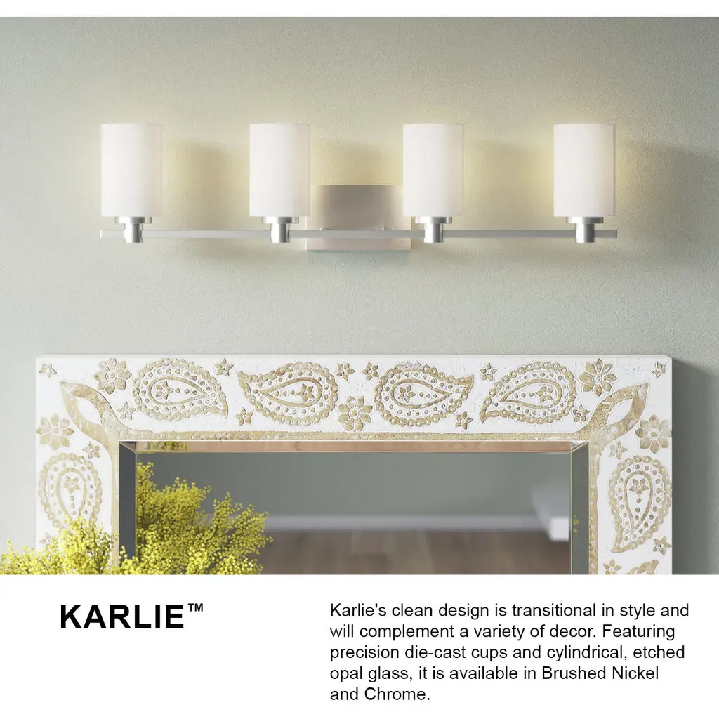 Karlie's clean design is transitional in style and will complement a variety of decor. Featuring precision die-cast cups and cylindrical, etched opal glass, it is available in Brushed Nickel and Chrome.
