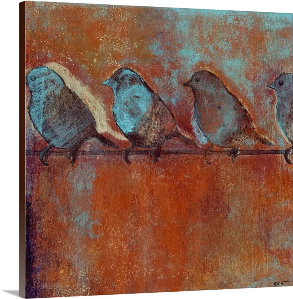 3 Robins on a Wire by Karrie Evenson is a high quality piece of canvas artwork. The finished size of this piece is 20" X 16", and it has a depth 0.75" with sage green painted sides. There is a UV protective coating over the entire image, and it is ready to hang on your wall with a standard drywall screw (not included). 100% Satisfaction Guaranteed.